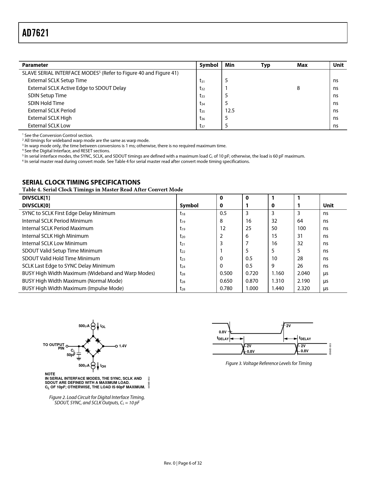 link to page 6 link to page 25 link to page 25 link to page 20 link to page 21 link to page 21 link to page 6 AD7621Parameter SymbolMinTypMaxUnit SLAVE SERIAL INTERFACE MODES5 (Refer to Figure 40 and Figure 41) External SCLK Setup Time t31 5 ns External SCLK Active Edge to SDOUT Delay t32 1 8 ns SDIN Setup Time t33 5 ns SDIN Hold Time t34 5 ns External SCLK Period t35 12.5 ns External SCLK High t36 5 ns External SCLK Low t37 5 ns 1 See the Conversion Control section. 2 All timings for wideband warp mode are the same as warp mode. 3 In warp mode only, the time between conversions is 1 ms; otherwise, there is no required maximum time. 4 See the Digital Interface, and RESET sections. 5 In serial interface modes, the SYNC, SCLK, and SDOUT timings are defined with a maximum load CL of 10 pF; otherwise, the load is 60 pF maximum. 6 In serial master read during convert mode. See Table 4 for serial master read after convert mode timing specifications. SERIAL CLOCK TIMING SPECIFICATIONS Table 4. Serial Clock Timings in Master Read After Convert Mode DIVSCLK[1]0 0 1 1DIVSCLK[0]Symbol 0 1 0 1 Unit SYNC to SCLK First Edge Delay Minimum t18 0.5 3 3 3 ns Internal SCLK Period Minimum t19 8 16 32 64 ns Internal SCLK Period Maximum t19 12 25 50 100 ns Internal SCLK High Minimum t20 2 6 15 31 ns Internal SCLK Low Minimum t21 3 7 16 32 ns SDOUT Valid Setup Time Minimum t22 1 5 5 5 ns SDOUT Valid Hold Time Minimum t23 0 0.5 10 28 ns SCLK Last Edge to SYNC Delay Minimum t24 0 0.5 9 26 ns BUSY High Width Maximum (Wideband and Warp Modes) t28 0.500 0.720 1.160 2.040 μs BUSY High Width Maximum (Normal Mode) t28 0.650 0.870 1.310 2.190 μs BUSY High Width Maximum (Impulse Mode) t28 0.780 1.000 1.440 2.320 μs 500 μ AIOL2V0.8VttDELAYDELAYTO OUTPUT1.4V2V2VPINCL0.8V0.8V50pF 05665-003 Figure 3. Voltage Reference Levels for Timing 500 μ AIOHNOTE IN SERIAL INTERFACE MODES, THE SYNC, SCLK AND SDOUT ARE DEFINED WITH A MAXIMUM LOAD. C 04565-002 L OF 10pF; OTHERWISE, THE LOAD IS 60pF MAXIMUM. Figure 2. Load Circuit for Digital Interface Timing, SDOUT, SYNC, and SCLK Outputs, CL = 10 pF Rev. 0 | Page 6 of 32 Document Outline FEATURES APPLICATIONS GENERAL DESCRIPTION FUNCTIONAL BLOCK DIAGRAM PRODUCT HIGHLIGHTS SPECIFICATIONS TIMING SPECIFICATIONS SERIAL CLOCK TIMING SPECIFICATIONS ABSOLUTE MAXIMUM RATINGS ESD CAUTION PIN CONFIGURATION AND FUNCTION DESCRIPTIONS TERMINOLOGY TYPICAL PERFORMANCE CHARACTERISTICS THEORY OF OPERATION CIRCUIT INFORMATION CONVERTER OPERATION MODES OF OPERATION TRANSFER FUNCTIONS TYPICAL CONNECTION DIAGRAM ANALOG INPUTS DRIVER AMPLIFIER CHOICE Single-to-Differential Driver VOLTAGE REFERENCE INPUT Internal Reference External 1.2 V Reference and Internal Buffer External Reference Reference Decoupling Temperature Sensor POWER SUPPLY Power Sequencing Power-Up POWER DISSIPATION VS. THROUGHPUT CONVERSION CONTROL INTERFACES DIGITAL INTERFACE RESET PARALLEL INTERFACE Master Parallel Interface Slave Parallel Interface 8-Bit Interface (Master or Slave) SERIAL INTERFACE MASTER SERIAL INTERFACE Internal Clock SLAVE SERIAL INTERFACE External Clock External Discontinuous Clock Data Read After Conversion External Clock Data Read During Previous Conversion MICROPROCESSOR INTERFACING SPI Interface (ADSP-219x) APPLICATION LAYOUT EVALUATING THE AD7621 PERFORMANCE OUTLINE DIMENSIONS ORDERING GUIDE