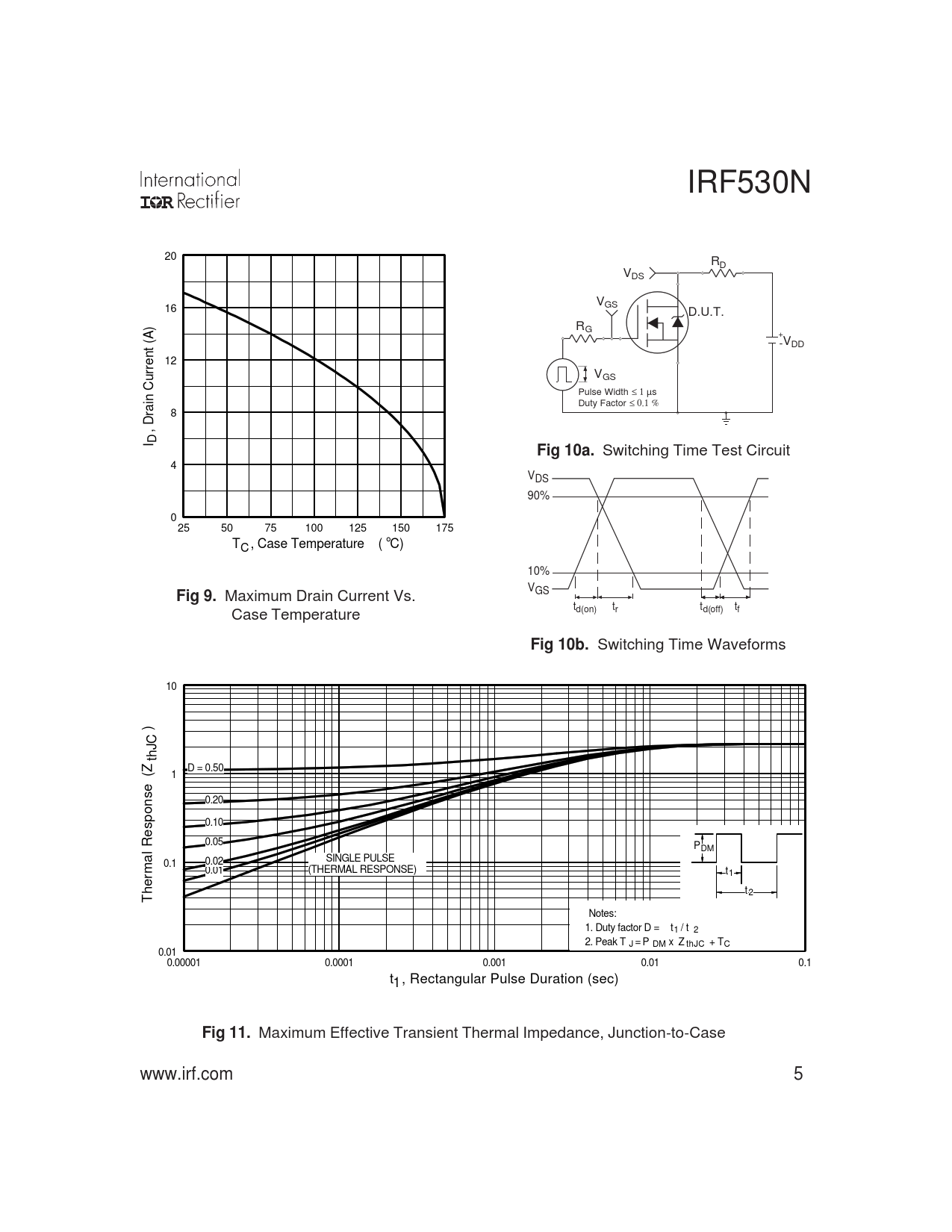 IRF530N 20 RD VDS V 16 GS D.U.T. RG + -VDD 12 VGS Pulse Width ≤ 1 µs Duty Factor ≤ 0.1 % 8 I , Drain Current (A) D Fig 10a. Switching Time Test Circuit 4 VDS 90% 0 25 50 75 100 125 150 175 T , Case Temperature ( C) ° C 10% V Fig 9. Maximum Drain Current Vs. GS t Case Temperature d(on) tr td(off) tf Fig 10b. Switching Time Waveforms 10 thJC (Z ) D = 0.50 1 0.20 0.10 0.05 DM 0.1 0.02 SINGLE PULSE 0.01 (THERMAL RESPONSE) Thermal Response P t1 t 2 Notes: 1. Duty factor D = t / t 1 2 2. Peak T = P x Z + T J DM thJC C 0.01 0.00001 0.0001 0.001 0.01 0.1 t , Rectangular Pulse Duration (sec) 1 Fig 11. Maximum Effective Transient Thermal Impedance, Junction-to-Case www.irf.com 5