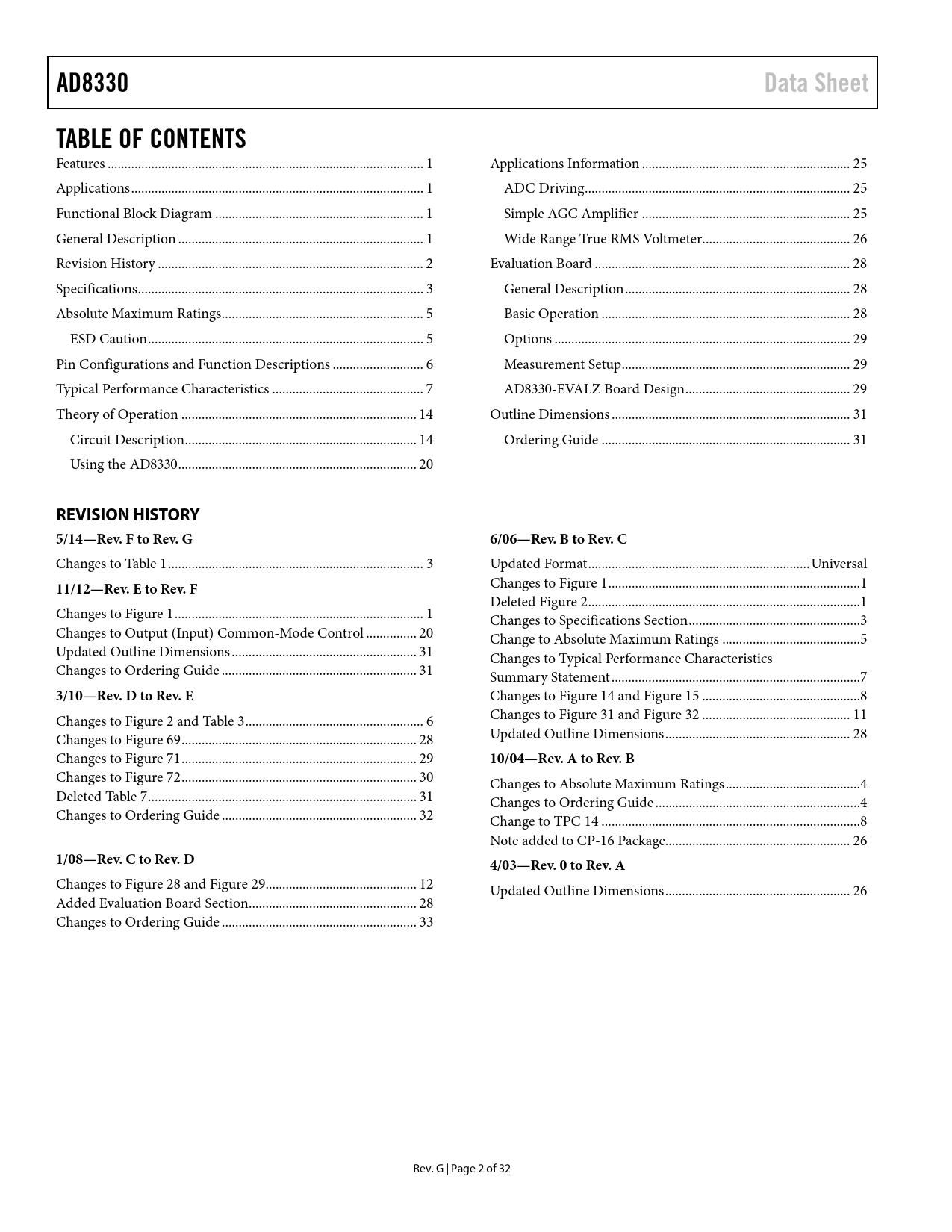 Páginas / Página32 / 2 — AD8330. Data Sheet. TABLE OF CONTENTS. REVISION HISTORY 5/14—Rev. F to …