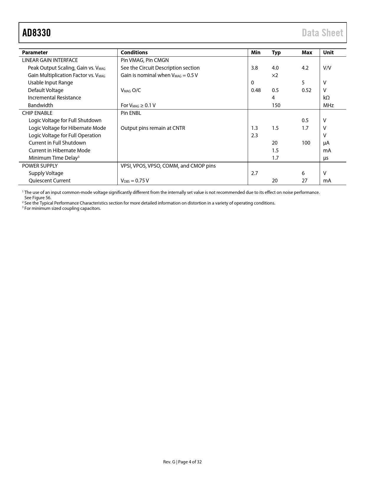 link to page 14 link to page 19 link to page 7 AD8330Data SheetParameterConditionsMinTypMaxUnit LINEAR GAIN INTERFACE Pin VMAG, Pin CMGN Peak Output Scaling, Gain vs. VMAG See the Circuit Description section 3.8 4.0 4.2 V/V Gain Multiplication Factor vs. VMAG Gain is nominal when VMAG = 0.5 V ×2 Usable Input Range 0 5 V Default Voltage VMAG O/C 0.48 0.5 0.52 V Incremental Resistance 4 kΩ Bandwidth For VMAG ≥ 0.1 V 150 MHz CHIP ENABLE Pin ENBL Logic Voltage for Full Shutdown 0.5 V Logic Voltage for Hibernate Mode Output pins remain at CNTR 1.3 1.5 1.7 V Logic Voltage for Full Operation 2.3 V Current in Full Shutdown 20 100 μA Current in Hibernate Mode 1.5 mA Minimum Time Delay3 1.7 μs POWER SUPPLY VPSI, VPOS, VPSO, COMM, and CMOP pins Supply Voltage 2.7 6 V Quiescent Current VDBS = 0.75 V 20 27 mA 1 The use of an input common-mode voltage significantly different from the internally set value is not recommended due to its effect on noise performance. See Figure 56. 2 See the Typical Performance Characteristics section for more detailed information on distortion in a variety of operating conditions. 3 For minimum sized coupling capacitors. Rev. G | Page 4 of 32 Document Outline Features Applications Functional Block Diagram General Description Table of Contents Revision History Specifications Absolute Maximum Ratings ESD Caution Pin Configurations and Function Descriptions Typical Performance Characteristics Theory of Operation Circuit Description Overall Structure Normal Operating Conditions Linear-in-dB Gain Control (VDBS) Inversion of the Gain Slope Gain Magnitude Control (VMAG) Two Classes of Variable Gain Amplifiers Amplitude/Phase Response Noise, Input Capacity, and Dynamic Range Dynamic Range Input Common-Mode Range and Rejection Ratio Output Noise and Peak Swing Offset Compensation Effects of Loading on Gain and AC Response Gain Errors Due to On-Chip Resistor Tolerances Output (Input) Common-Mode Control Using the AD8330 Gain and Swing Adjustments When Loaded Input Coupling DC-Coupled Signal Path Using Single-Sided Sources and Loads Pulse Operation Preserving Absolute Gain Calculation of Noise Figure Noise as a Function of VDBS Distortion Considerations P1dB and V1dB Applications Information ADC Driving Simple AGC Amplifier Wide Range True RMS Voltmeter Evaluation Board General Description Basic Operation Options Measurement Setup AD8330-EVALZ Board Design Outline Dimensions Ordering Guide