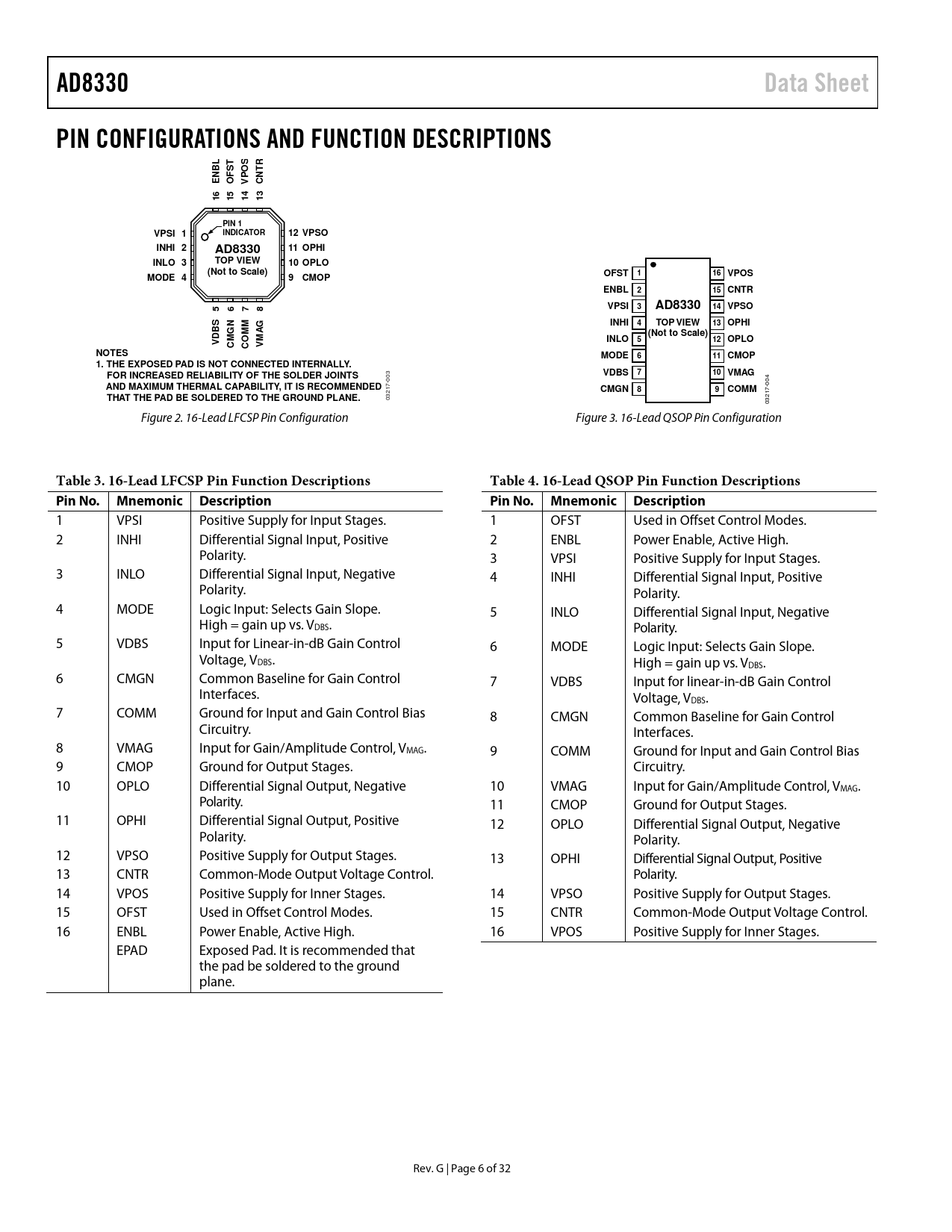 Table 3. 16-Lead LFCSP Pin Function Descriptions Table 4. 16-Lead QSOP Pin Function Descriptions Pin No. Mnemonic Description Pin No. Mnemonic Description