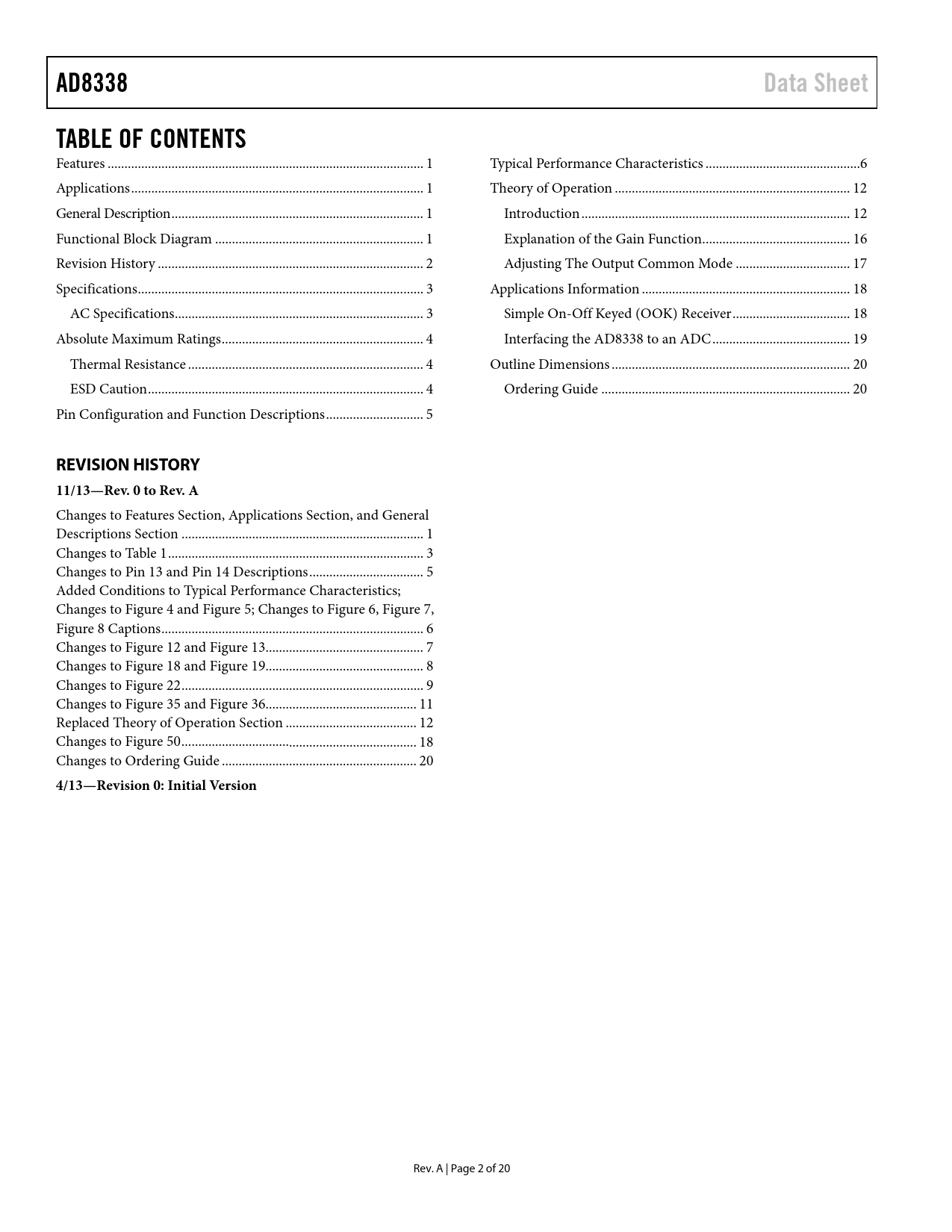 Páginas / Página20 / 2 — AD8338. Data Sheet. TABLE OF CONTENTS. REVISION HISTORY 11/13—Rev. 0 to …