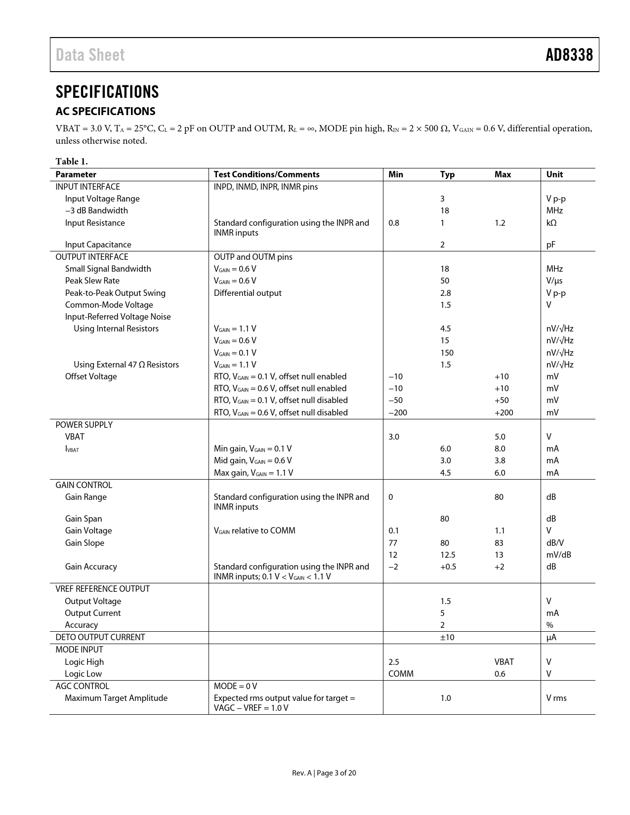 Data Sheet. AD8338. SPECIFICATIONS AC SPECIFICATIONS. Table 1. Parameter. Test Conditions/Comments. Min. Typ. Max. Unit