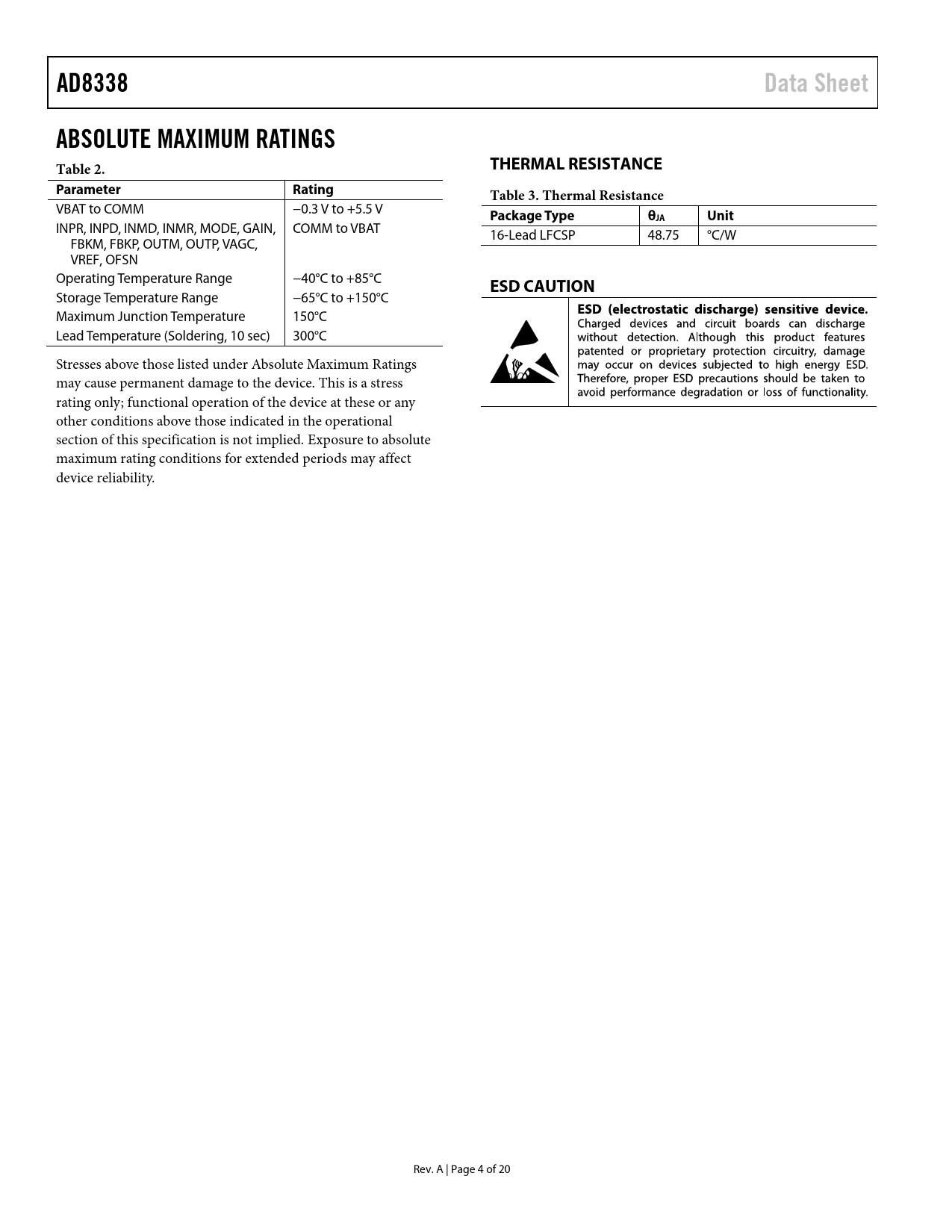AD8338Data SheetABSOLUTE MAXIMUM RATINGS Table 2.THERMAL RESISTANCEParameter RatingTable 3. Thermal Resistance VBAT to COMM −0.3 V to +5.5 V Package TypeθJA Unit INPR, INPD, INMD, INMR, MODE, GAIN, COMM to VBAT 16-Lead LFCSP 48.75 °C/W FBKM, FBKP, OUTM, OUTP, VAGC, VREF, OFSN Operating Temperature Range −40°C to +85°C ESD CAUTION Storage Temperature Range −65°C to +150°C Maximum Junction Temperature 150°C Lead Temperature (Soldering, 10 sec) 300°C Stresses above those listed under Absolute Maximum Ratings may cause permanent damage to the device. This is a stress rating only; functional operation of the device at these or any other conditions above those indicated in the operational section of this specification is not implied. Exposure to absolute maximum rating conditions for extended periods may affect device reliability. Rev. A | Page 4 of 20 Document Outline Features Applications General Description Functional Block Diagram Revision History Specifications AC Specifications Absolute Maximum Ratings Thermal Resistance ESD Caution Pin Configuration and Function Descriptions Typical Performance Characteristics Theory of Operation Introduction Overall Structure of the AD8338 VGA Core Normal Operating Conditions INPR, INMR, INPD, and INMD Pins FBKP, FBKM, OUTP, and OUTM Pins Linear-in-dB Gain Control, GAIN Pin Inversion of the Gain Slope, MODE Pin Offset Correction Circuit, OFSN Pin AGC Circuit, VAGC Pin Internal Reference, Pin VREF Explanation of the Gain Function Effects of Using External Resistors Adjusting The Output Common-Mode Voltage Applications Information Simple On-Off Keyed (OOK) Receiver Interfacing the AD8338 to an ADC Outline Dimensions Ordering Guide
