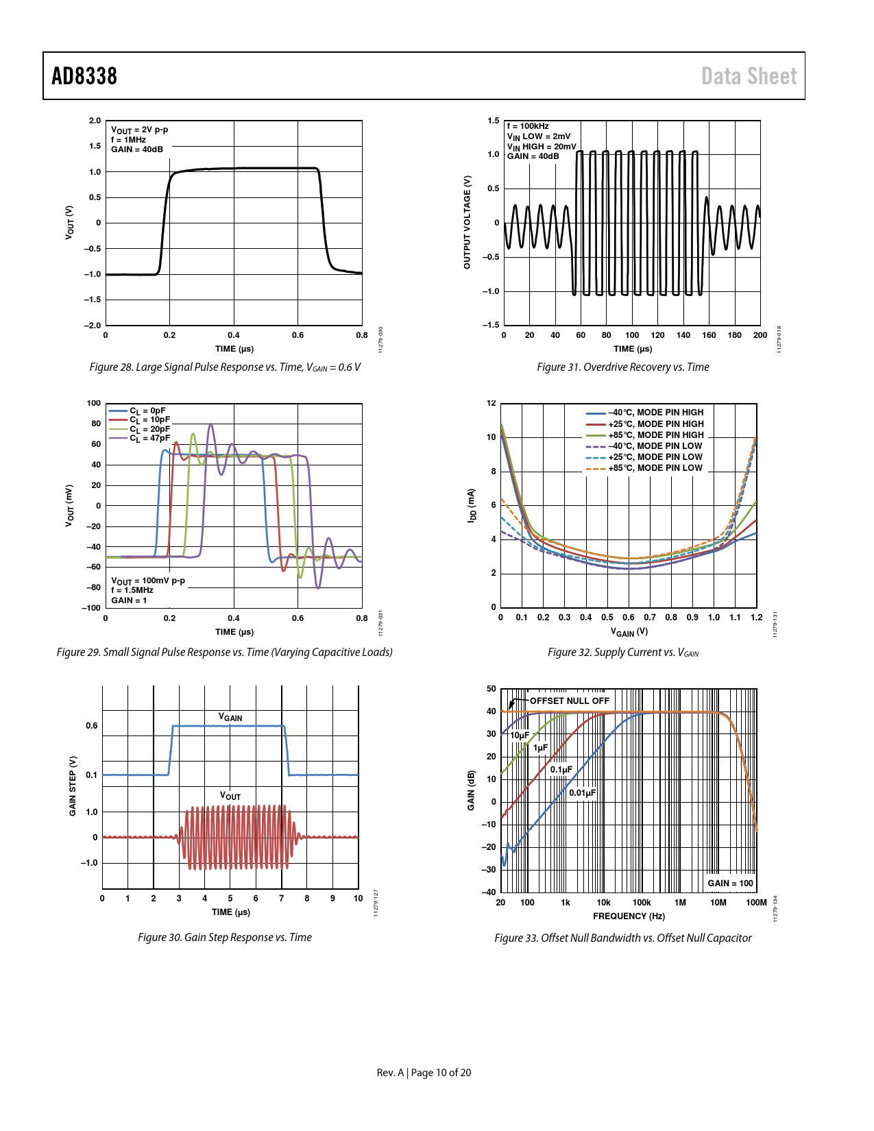 11279- Figure 28. Large Signal Pulse Response vs. Time, VGAIN = 0.6 V Figure 31. Overdrive Recovery vs. Time