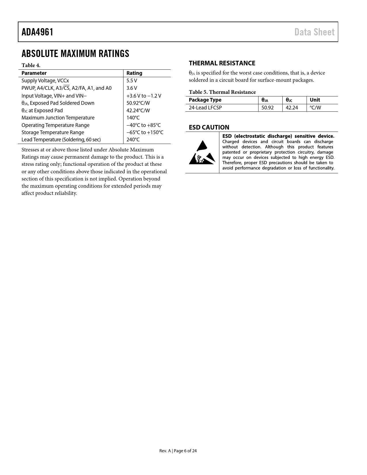 Páginas / Página24 / 6 — ADA4961. Data Sheet. ABSOLUTE MAXIMUM RATINGS Table 4. THERMAL …