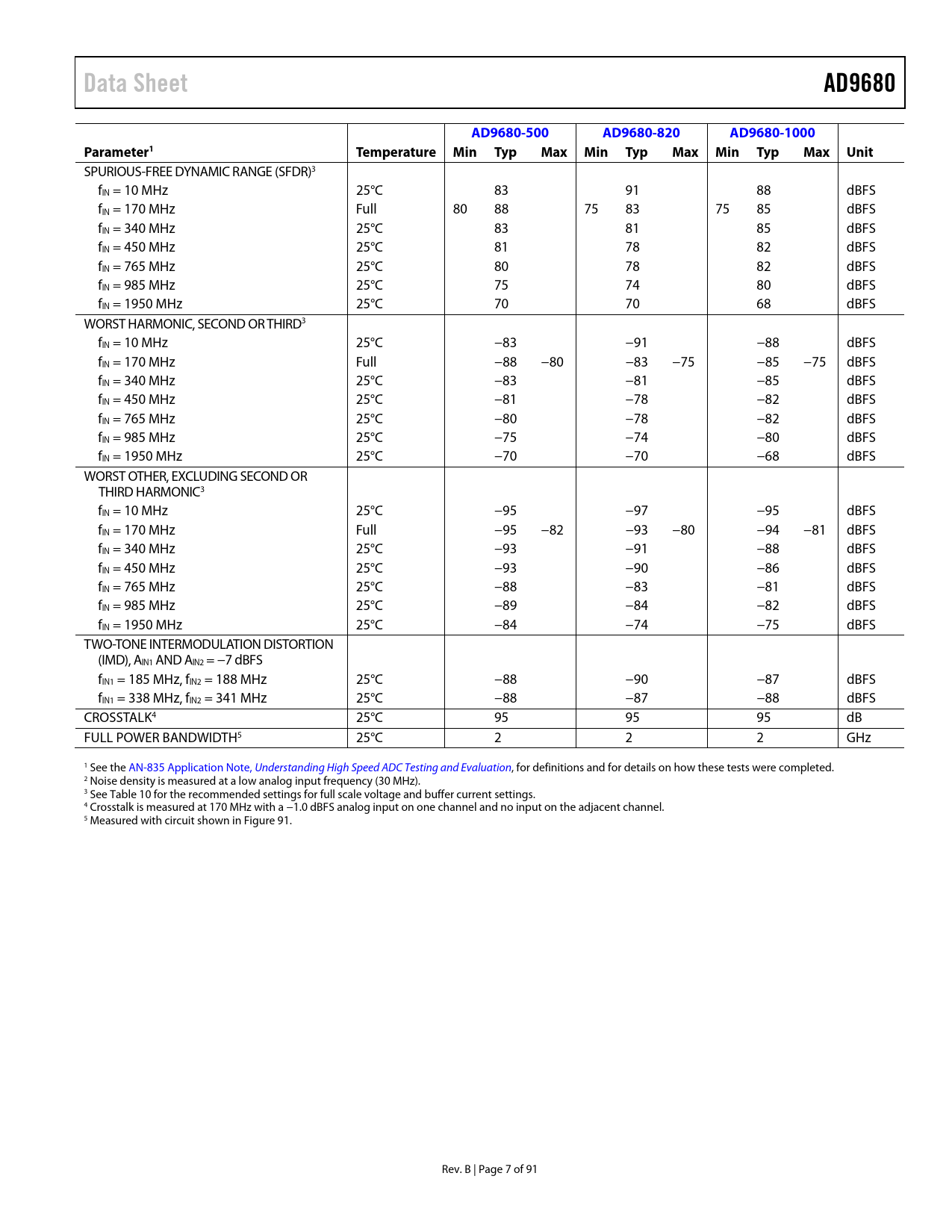 link to page 34 link to page 31 Data SheetAD9680AD9680-500AD9680-820AD9680-1000Parameter1Temperature Min Typ Max Min Typ Max Min Typ Max Unit SPURIOUS-FREE DYNAMIC RANGE (SFDR)3 fIN = 10 MHz 25°C 83 91 88 dBFS fIN = 170 MHz Full 80 88 75 83 75 85 dBFS fIN = 340 MHz 25°C 83 81 85 dBFS fIN = 450 MHz 25°C 81 78 82 dBFS fIN = 765 MHz 25°C 80 78 82 dBFS fIN = 985 MHz 25°C 75 74 80 dBFS fIN = 1950 MHz 25°C 70 70 68 dBFS WORST HARMONIC, SECOND OR THIRD3 fIN = 10 MHz 25°C −83 −91 −88 dBFS fIN = 170 MHz Full −88 −80 −83 −75 −85 −75 dBFS fIN = 340 MHz 25°C −83 −81 −85 dBFS fIN = 450 MHz 25°C −81 −78 −82 dBFS fIN = 765 MHz 25°C −80 −78 −82 dBFS fIN = 985 MHz 25°C −75 −74 −80 dBFS fIN = 1950 MHz 25°C −70 −70 −68 dBFS WORST OTHER, EXCLUDING SECOND OR THIRD HARMONIC3 fIN = 10 MHz 25°C −95 −97 −95 dBFS fIN = 170 MHz Full −95 −82 −93 −80 −94 −81 dBFS fIN = 340 MHz 25°C −93 −91 −88 dBFS fIN = 450 MHz 25°C −93 −90 −86 dBFS fIN = 765 MHz 25°C −88 −83 −81 dBFS fIN = 985 MHz 25°C −89 −84 −82 dBFS fIN = 1950 MHz 25°C −84 −74 −75 dBFS TWO-TONE INTERMODULATION DISTORTION (IMD), AIN1 AND AIN2 = −7 dBFS fIN1 = 185 MHz, fIN2 = 188 MHz 25°C −88 −90 −87 dBFS fIN1 = 338 MHz, fIN2 = 341 MHz 25°C −88 −87 −88 dBFS CROSSTALK4 25°C 95 95 95 dB FULL POWER BANDWIDTH5 25°C 2 2 2 GHz 1 See the AN-835 Application Note, Understanding High Speed ADC Testing and Evaluation, for definitions and for details on how these tests were completed. 2 Noise density is measured at a low analog input frequency (30 MHz). 3 See Table 10 for the recommended settings for full scale voltage and buffer current settings. 4 Crosstalk is measured at 170 MHz with a −1.0 dBFS analog input on one channel and no input on the adjacent channel. 5 Measured with circuit shown in Figure 91. Rev. B | Page 7 of 91 Document Outline FEATURES APPLICATIONS FUNCTIONAL BLOCK DIAGRAM PRODUCT HIGHLIGHTS TABLE OF CONTENTS REVISION HISTORY GENERAL DESCRIPTION SPECIFICATIONS DC SPECIFICATIONS AC SPECIFICATIONS DIGITAL SPECIFICATIONS SWITCHING SPECIFICATIONS TIMING SPECIFICATIONS Timing Diagrams ABSOLUTE MAXIMUM RATINGS THERMAL CHARACTERISTICS ESD CAUTION PIN CONFIGURATION AND FUNCTION DESCRIPTIONS TYPICAL PERFORMANCE CHARACTERISTICS AD9680-1000 AD9680-820 AD9680-500 EQUIVALENT CIRCUITS THEORY OF OPERATION ADC ARCHITECTURE ANALOG INPUT CONSIDERATIONS Differential Input Configurations Input Common Mode Analog Input Buffer Controls and SFDR Optimization Input Buffer Control Registers (0x018, 0x019, 0x01A, 0x935, 0x934, 0x11A) Absolute Maximum Input Swing VOLTAGE REFERENCE CLOCK INPUT CONSIDERATIONS Clock Duty Cycle Considerations Input Clock Divider Input Clock Divider ½ Period Delay Adjust Clock Fine Delay Adjust Clock Jitter Considerations Power-Down/Standby Mode Temperature Diode ADC OVERRANGE AND FAST DETECT ADC OVERRANGE FAST THRESHOLD DETECTION (FD_A AND FD_B) SIGNAL MONITOR SPORT OVER JESD204B DIGITAL DOWNCONVERTER (DDC) DDC I/Q INPUT SELECTION DDC I/Q OUTPUT SELECTION DDC GENERAL DESCRIPTION FREQUENCY TRANSLATION GENERAL DESCRIPTION Variable IF Mode 0 Hz IF (ZIF) Mode fS/4 Hz IF Mode Test Mode DDC NCO PLUS MIXER LOSS AND SFDR NUMERICALLY CONTROLLED OSCILLATOR Setting Up the NCO FTW and POW NCO Synchronization Mixer FIR FILTERS GENERAL DESCRIPTION HALF-BAND FILTERS HB4 Filter HB3 Filter HB2 Filter HB1 Filter DDC GAIN STAGE DDC COMPLEX TO REAL CONVERSION DDC EXAMPLE CONFIGURATIONS DIGITAL OUTPUTS INTRODUCTION TO THE JESD204B INTERFACE JESD204B OVERVIEW FUNCTIONAL OVERVIEW Transport Layer Data Link Layer Physical Layer JESD204B LINK ESTABLISHMENT Code Group Synchronization (CGS) and SYNCINB± Initial Lane Alignment Sequence (ILAS) User Data and Error Detection 8-Bit/10-Bit Encoder PHYSICAL LAYER (DRIVER) OUTPUTS Digital Outputs, Timing, and Controls De-Emphasis Phase-Locked Loop JESD204B TX CONVERTER MAPPING CONFIGURING THE JESD204B LINK Example 1: Full Bandwidth Mode Example 2: ADC with DDC Option (Two ADCs Plus Four DDCs) MULTICHIP SYNCHRONIZATION SYSREF± SETUP/HOLD WINDOW MONITOR TEST MODES ADC TEST MODES JESD204B BLOCK TEST MODES Transport Layer Sample Test Mode Interface Test Modes Data Link Layer Test Modes SERIAL PORT INTERFACE CONFIGURATION USING THE SPI HARDWARE INTERFACE SPI ACCESSIBLE FEATURES MEMORY MAP READING THE MEMORY MAP REGISTER TABLE Open and Reserved Locations Default Values Logic Levels Channel-Specific Registers SPI Soft Reset MEMORY MAP REGISTER TABLE APPLICATIONS INFORMATION POWER SUPPLY RECOMMENDATIONS EXPOSED PAD THERMAL HEAT SLUG RECOMMENDATIONS AVDD1_SR (PIN 57) AND AGND (PIN 56 AND PIN 60) OUTLINE DIMENSIONS ORDERING GUIDE