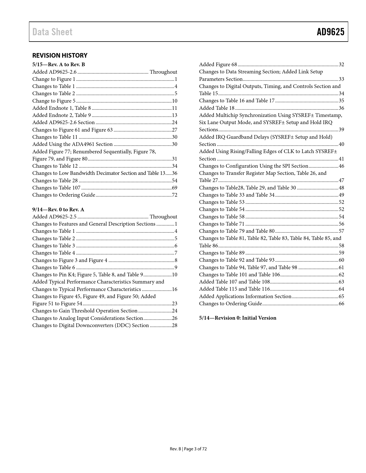 Páginas / Página72 / 3 — Data Sheet. AD9625. REVISION HISTORY. 5/15—Rev. A to Rev. B. 9/14—Rev. 0 …