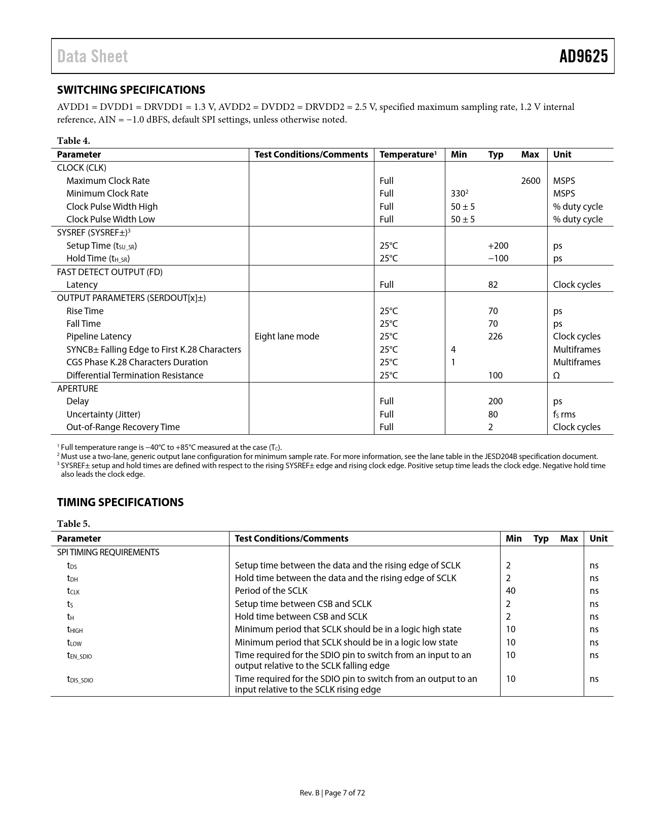 Data SheetAD9625SWITCHING SPECIFICATIONS AVDD1 = DVDD1 = DRVDD1 = 1.3 V, AVDD2 = DVDD2 = DRVDD2 = 2.5 V, specified maximum sampling rate, 1.2 V internal reference, AIN = −1.0 dBFS, default SPI settings, unless otherwise noted. Table 4. ParameterTest Conditions/Comments Temperature1MinTypMaxUnit CLOCK (CLK) Maximum Clock Rate Full 2600 MSPS Minimum Clock Rate Full 3302 MSPS Clock Pulse Width High Full 50 ± 5 % duty cycle Clock Pulse Width Low Full 50 ± 5 % duty cycle SYSREF (SYSREF±)3 Setup Time (tSU_SR) 25°C +200 ps Hold Time (tH_SR) 25°C −100 ps FAST DETECT OUTPUT (FD) Latency Full 82 Clock cycles OUTPUT PARAMETERS (SERDOUT[x]±) Rise Time 25°C 70 ps Fall Time 25°C 70 ps Pipeline Latency Eight lane mode 25°C 226 Clock cycles SYNCB± Falling Edge to First K.28 Characters 25°C 4 Multiframes CGS Phase K.28 Characters Duration 25°C 1 Multiframes Differential Termination Resistance 25°C 100 Ω APERTURE Delay Full 200 ps Uncertainty (Jitter) Full 80 fS rms Out-of-Range Recovery Time Full 2 Clock cycles 1 Full temperature range is −40°C to +85°C measured at the case (TC). 2 Must use a two-lane, generic output lane configuration for minimum sample rate. For more information, see the lane table in the JESD204B specification document. 3 SYSREF± setup and hold times are defined with respect to the rising SYSREF± edge and rising clock edge. Positive setup time leads the clock edge. Negative hold time also leads the clock edge. TIMING SPECIFICATIONSTable 5. ParameterTest Conditions/CommentsMin Typ Max Unit SPI TIMING REQUIREMENTS tDS Setup time between the data and the rising edge of SCLK 2 ns tDH Hold time between the data and the rising edge of SCLK 2 ns tCLK Period of the SCLK 40 ns tS Setup time between CSB and SCLK 2 ns tH Hold time between CSB and SCLK 2 ns tHIGH Minimum period that SCLK should be in a logic high state 10 ns tLOW Minimum period that SCLK should be in a logic low state 10 ns tEN_SDIO Time required for the SDIO pin to switch from an input to an 10 ns output relative to the SCLK falling edge tDIS_SDIO Time required for the SDIO pin to switch from an output to an 10 ns input relative to the SCLK rising edge Rev. B | Page 7 of 72 Document Outline FEATURES APPLICATIONS FUNCTIONAL BLOCK DIAGRAM GENERAL DESCRIPTION PRODUCT HIGHLIGHTS TABLE OF CONTENTS REVISION HISTORY SPECIFICATIONS DC SPECIFICATIONS AC SPECIFICATIONS DIGITAL SPECIFICATIONS SWITCHING SPECIFICATIONS TIMING SPECIFICATIONS Timing Diagrams ABSOLUTE MAXIMUM RATINGS THERMAL CHARACTERISTICS ESD CAUTION PIN CONFIGURATION AND FUNCTION DESCRIPTIONS TYPICAL PERFORMANCE CHARACTERISTICS AD9625-2.0 AD9625-2.5 AD9625-2.6 EQUIVALENT TEST CIRCUITS THEORY OF OPERATION ADC ARCHITECTURE FAST DETECT GAIN THRESHOLD OPERATION Threshold Operation Threshold Format TEST MODES ANALOG INPUT CONSIDERATIONS DIFFERENTIAL INPUT CONFIGURATIONS USING THE ADA4961 DC COUPLING CLOCK INPUT CONSIDERATIONS Clock Jitter Considerations Clock Duty Cycle Considerations DIGITAL DOWNCONVERTERS (DDC) FREQUENCY SYNTHESIZER AND MIXER NUMERICALLY CONTROLLED OSCILLATOR HIGH BANDWIDTH DECIMATOR LOW BANDWIDTH DECIMATOR DIGITAL OUTPUTS INTRODUCTION TO THE JESD204B INTERFACE FUNCTIONAL OVERVIEW Transport Layer Data Link Layer Physical Layer JESD204B LINK ESTABLISHMENT Code Group Synchronization (CGS) and SYNCINB± Initial Lane Alignment Sequence (ILAS) Data Streaming Link Setup Parameters 8-Bit/10-Bit Encoder Digital Outputs, Timing, and Controls De-Emphasis PHYSICAL LAYER OUTPUT SCRAMBLER TAIL BITS DDC MODES (SINGLE AND DUAL) CHECKSUM 8-BIT/10-BIT ENCODER CONTROL INITIAL LANE ALIGNMENT SEQUENCE (ILAS) LANE SYNCHRONIZATION Multichip Synchronization Using SYSREF± Timestamp Six Lane Output Mode ADC Output Control Bits on JESD204B Samples SYSREF± Setup and Hold IRQ IRQ Guardband Delays (SYSREF± Setup and Hold) Using Rising/Falling Edges of the CLK to Latch SYSREF± Test Modes JESD204B APPLICATION LAYERS fS × 2, fS × 4, fS × 8 Modes FRAME ALIGNMENT CHARACTER INSERTION THERMAL CONSIDERATIONS POWER SUPPLY CONSIDERATIONS SERIAL PORT INTERFACE (SPI) CONFIGURATION USING THE SPI HARDWARE INTERFACE MEMORY MAP READING THE MEMORY MAP REGISTER Open and Reserved Locations Default Values Logic Levels Transfer Register Map MEMORY MAP REGISTERS APPLICATIONS INFORMATION DESIGN GUIDELINES POWER AND GROUND RECOMMENDATIONS CLOCK STABILITY CONSIDERATIONS SPI PORT OUTLINE DIMENSIONS ORDERING GUIDE