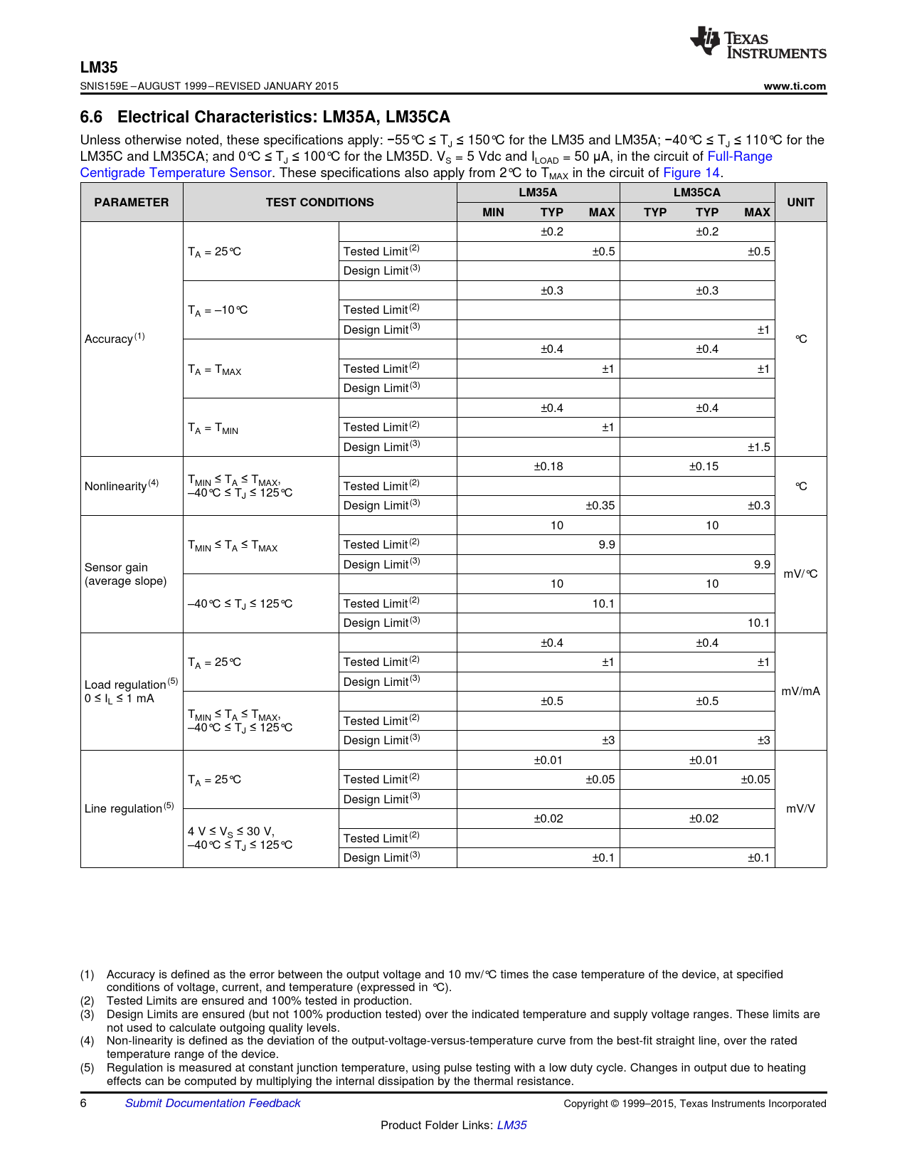 LM35. www.ti.com. 6.6 Electrical Characteristics: LM35A, LM35CA. LM35A. LM35CA. PARAMETER. TEST CONDITIONS. UNIT. MIN. TYP. MAX