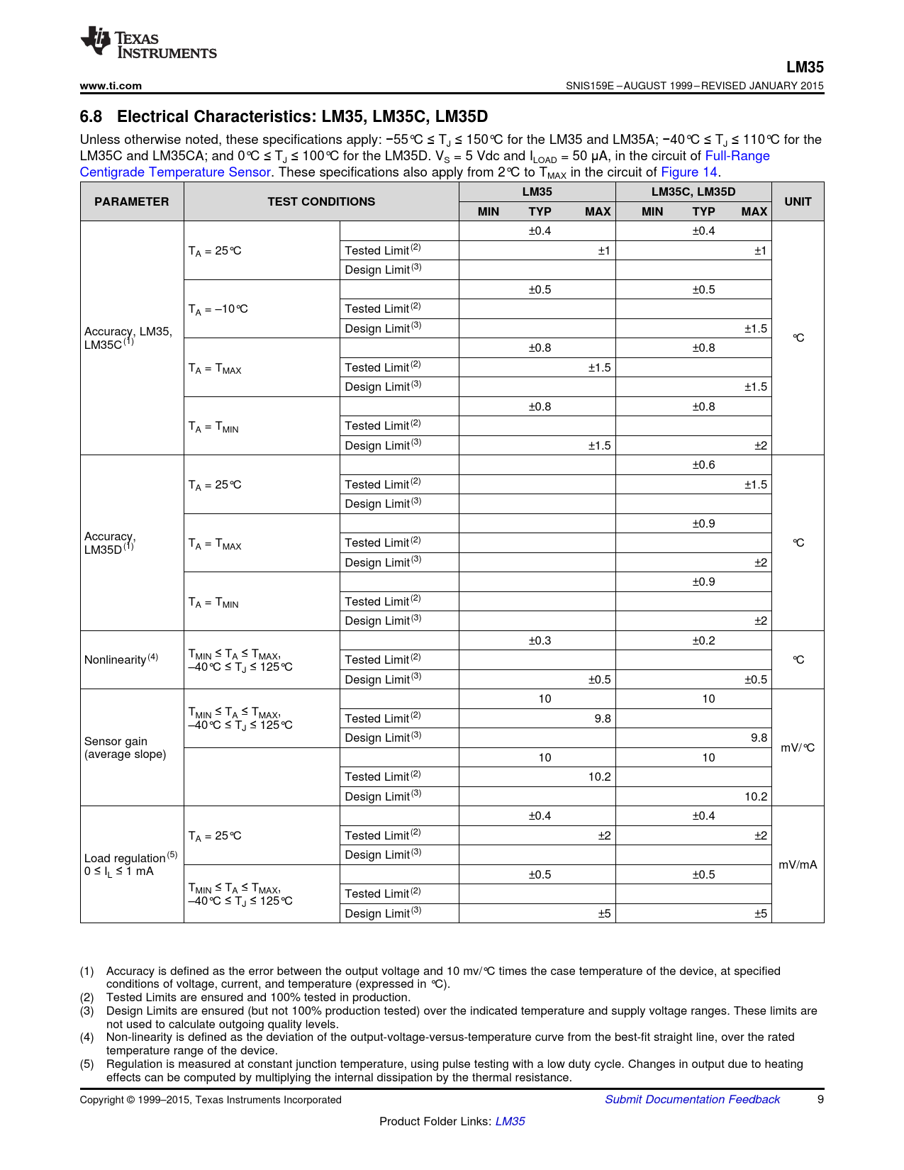 LM35. www.ti.com. 6.8 Electrical Characteristics: LM35, LM35C, LM35D. LM35C, LM35D. PARAMETER. TEST CONDITIONS. UNIT. MIN. TYP. MAX