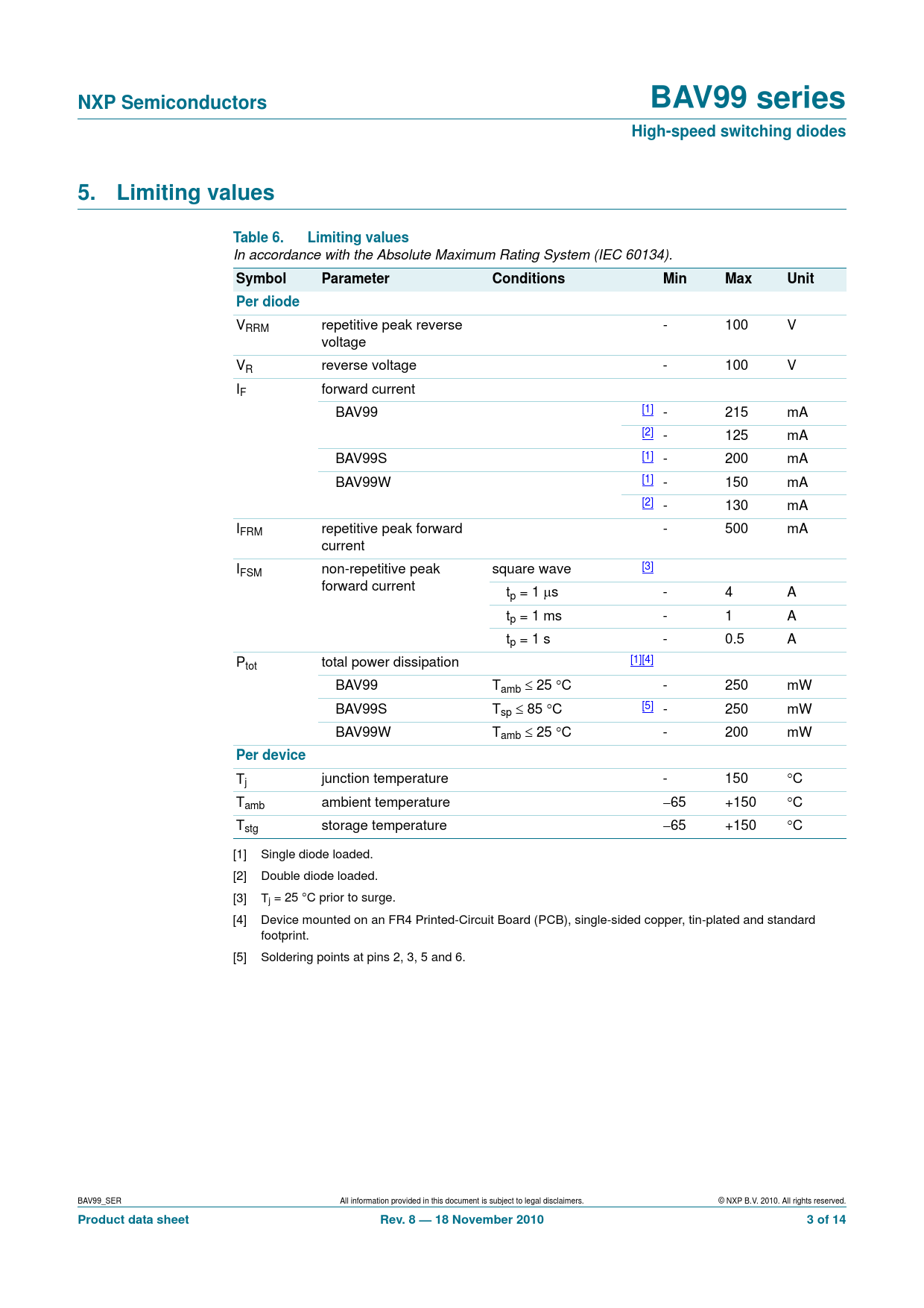 NXP Semiconductors. BAV99 series. High-speed switching diodes. 5. Limiting. values. Table 6. Limiting values. Symbol. Parameter