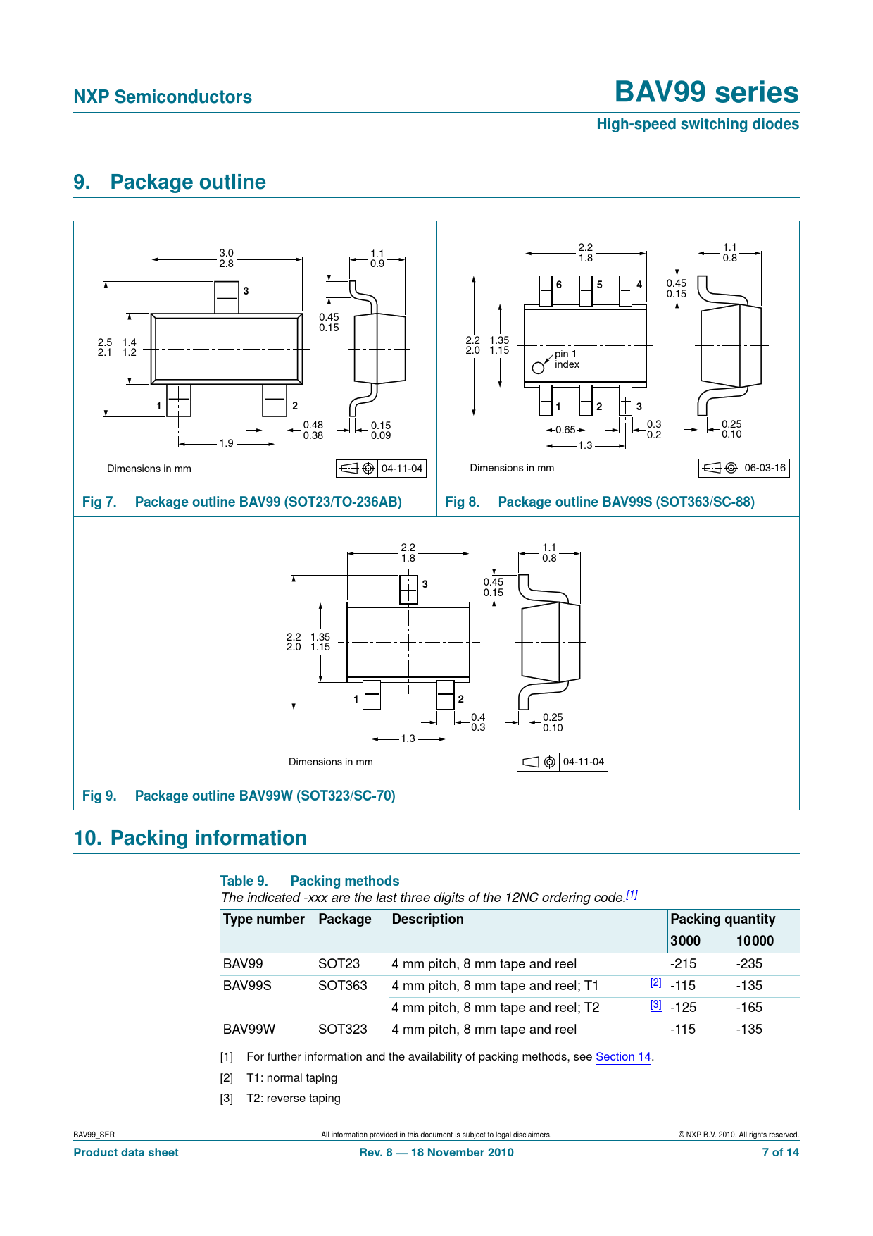 Fig 9. Package outline BAV99W (SOT323/SC-70) 10. Packing information Table 9. Packing methods