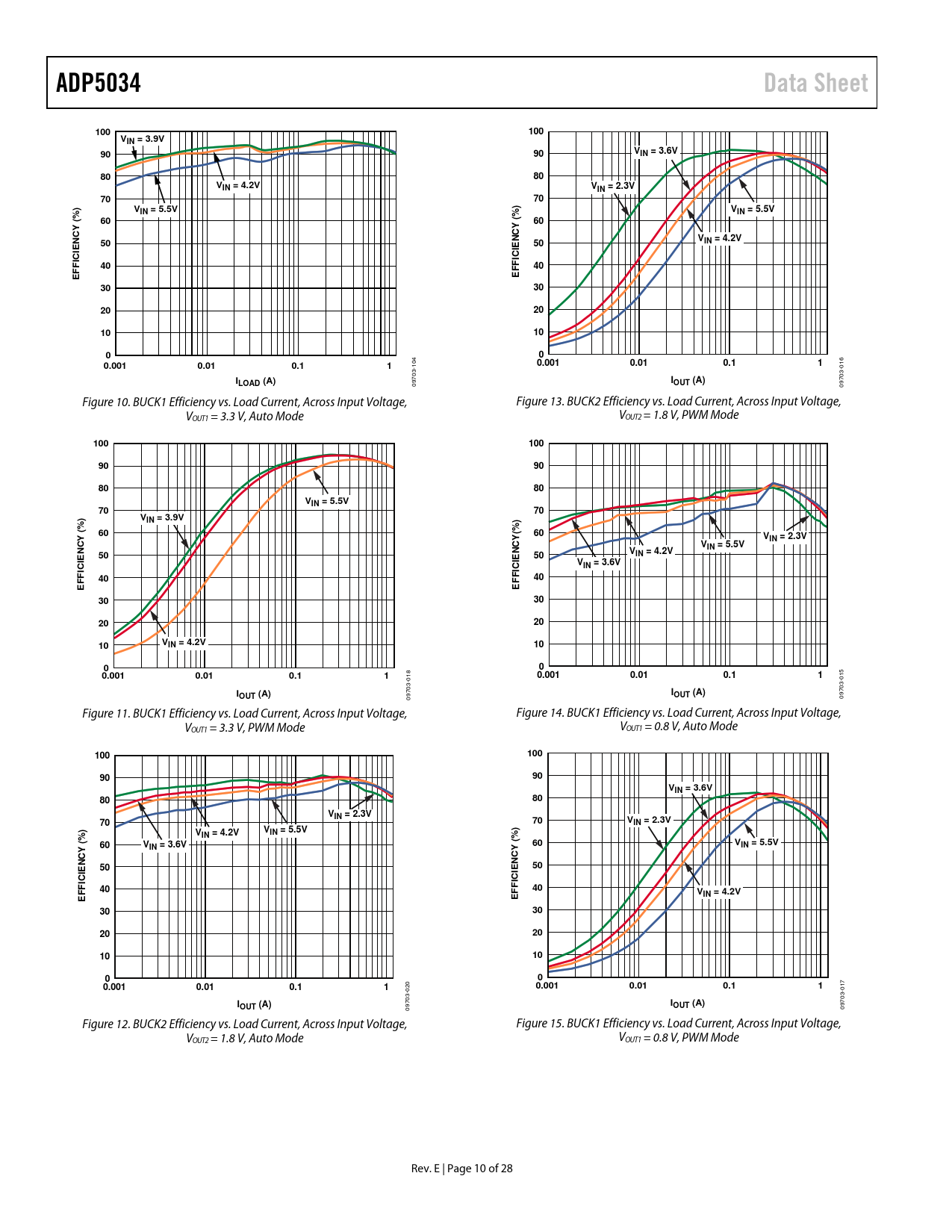 09703- 09703- Figure 11. BUCK1 Efficiency vs. Load Current, Across Input Voltage, Figure 14. BUCK1 Efficiency vs. Load Current, Across Input Voltage, VOUT1 = 3.3 V, PWM Mode VOUT1 = 0.8 V, Auto Mode
