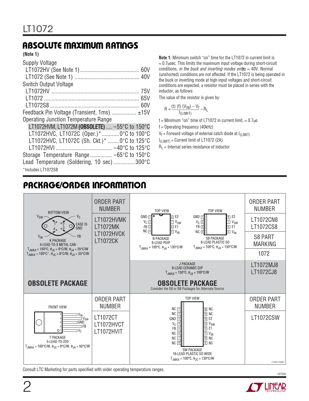 .. –55°C to 150°C f = Operating frequency (40kHz) LT1072HVC, LT1072C (Oper.)* .. 0°C to 100°C Vf = Forward voltage of external catch diode at I(LIMIT) LT1072HVC, LT1072C (Sh. Ckt.)* .. 0°C to 125°C I(LIMIT) = Current limit of LT1072 (2A) LT1072HVI ... –40°C to 125°C RL = Internal series resistance of inductor Storage Temperature Range ... –65°C to 150°C Lead Temperature (Soldering, 10 sec) ... 300°C *Includes LT1072S8