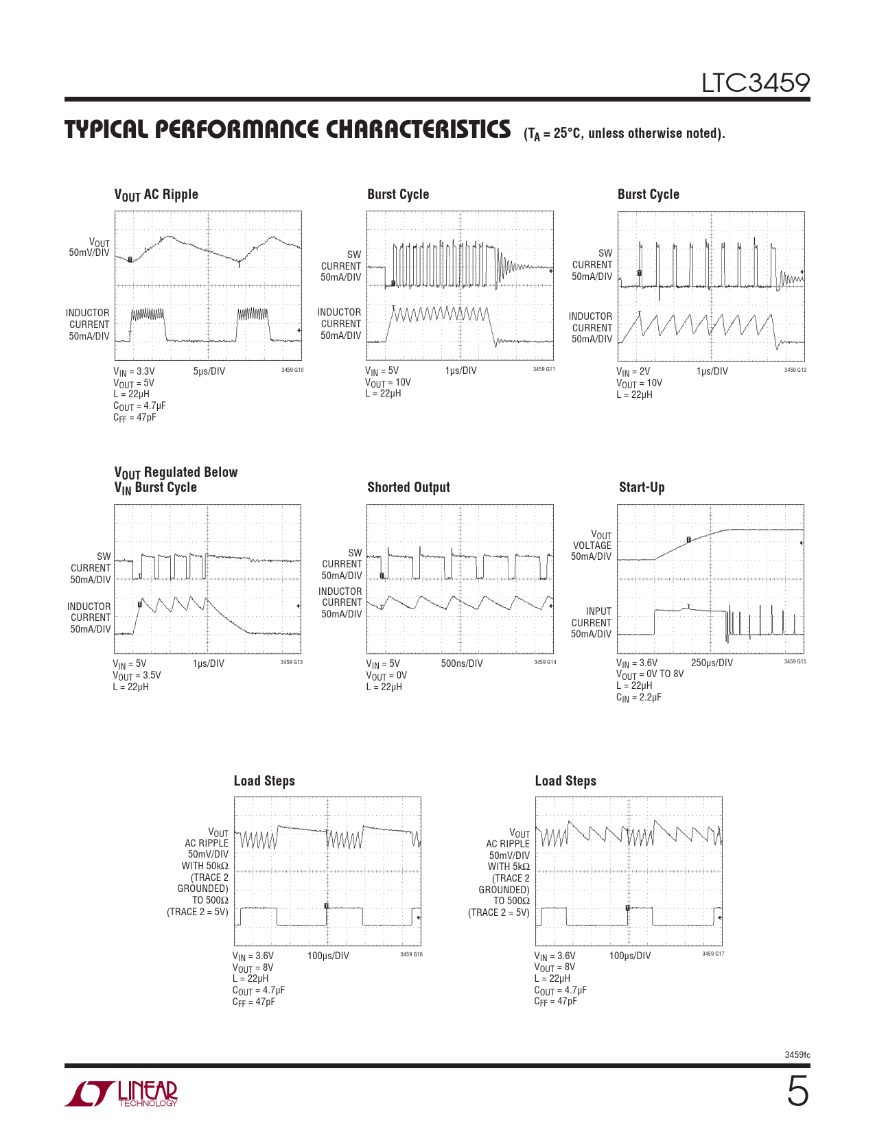 VOUT 50mV/DIV SW SW CURRENT CURRENT 50mA/DIV 50mA/DIV INDUCTOR INDUCTOR INDUCTOR CURRENT CURRENT CURRENT 50mA/DIV 50mA/DIV 50mA/DIV VIN = 3.3V 5μs/DIV 3459 G10 VIN = 5V 1μs/DIV 3459 G11 VIN = 2V 1μs/DIV 3459 G12 VOUT = 5V VOUT = 10V VOUT = 10V L = 22μH L = 22μH L = 22μH COUT = 4.7μF CFF = 47pF