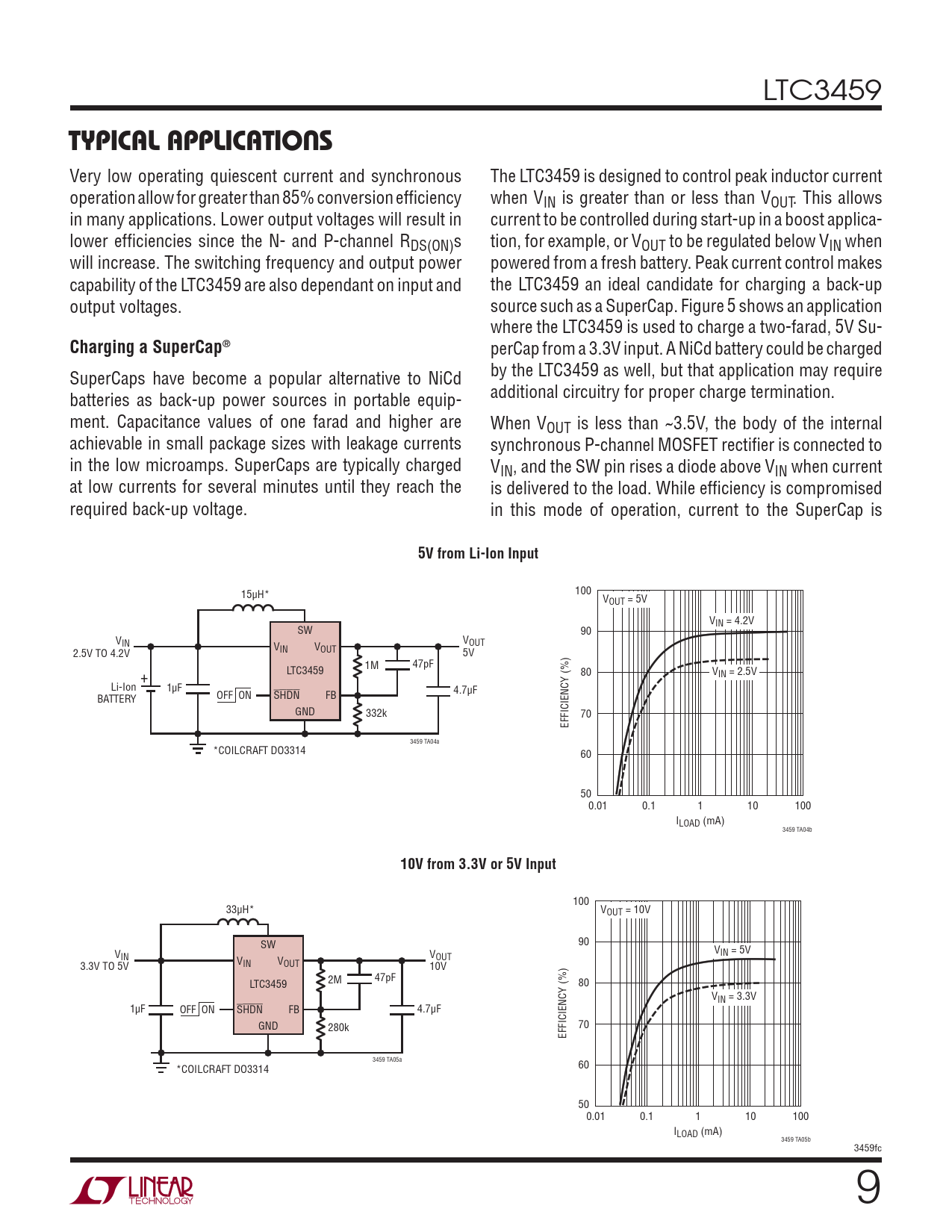 LTC3459 TYPICAL APPLICATIONS Very low operating quiescent current and synchronous The LTC3459 is designed to control peak inductor current operation allow for greater than 85% conversion effi ciency when VIN is greater than or less than VOUT. This allows in many applications. Lower output voltages will result in current to be controlled during start-up in a boost applica- lower effi ciencies since the N- and P-channel RDS(ON)s tion, for example, or VOUT to be regulated below VIN when will increase. The switching frequency and output power powered from a fresh battery. Peak current control makes capability of the LTC3459 are also dependant on input and the LTC3459 an ideal candidate for charging a back-up output voltages. source such as a SuperCap. Figure 5 shows an application where the LTC3459 is used to charge a two-farad, 5V Su- Charging a SuperCap® perCap from a 3.3V input. A NiCd battery could be charged SuperCaps have become a popular alternative to NiCd by the LTC3459 as well, but that application may require batteries as back-up power sources in portable equip- additional circuitry for proper charge termination. ment. Capacitance values of one farad and higher are When VOUT is less than ~3.5V, the body of the internal achievable in small package sizes with leakage currents synchronous P-channel MOSFET rectifi er is connected to in the low microamps. SuperCaps are typically charged VIN, and the SW pin rises a diode above VIN when current at low currents for several minutes until they reach the is delivered to the load. While effi ciency is compromised required back-up voltage. in this mode of operation, current to the SuperCap is 5V from Li-Ion Input 15μH* 100 VOUT = 5V VIN = 4.2V SW 90 V V IN V OUT IN VOUT 2.5V TO 4.2V 5V 1M 47pF LTC3459 + 80 VIN = 2.5V Li-Ion 1μF 4.7μF OFF ON SHDN FB BATTERY GND 332k 70 EFFICIENCY (%) 3459 TA04a *COILCRAFT DO3314 60 50 0.01 0.1 1 10 100 ILOAD (mA) 3459 TA04b 10V from 3.3V or 5V Input 100 33μH* VOUT = 10V SW 90 V V V IN IN = 5V V OUT IN V 3.3V TO 5V OUT 10V 2M 47pF LTC3459 80 VIN = 3.3V 1μF OFF ON SHDN FB 4.7μF GND 280k 70 EFFICIENCY (%) 3459 TA05a *COILCRAFT DO3314 60 50 0.01 0.1 1 10 100 ILOAD (mA) 3459 TA05b 3459fc 9
