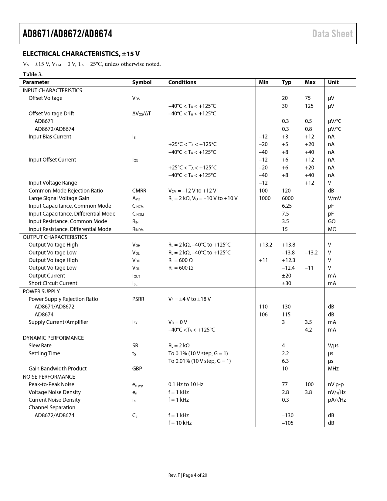 AD8671/AD8672/AD8674Data SheetELECTRICAL CHARACTERISTICS, ±15 V VS = ±15 V, VCM = 0 V, TA = 25°C, unless otherwise noted. Table 3. ParameterSymbolConditionsMinTypMaxUnit INPUT CHARACTERISTICS Offset Voltage VOS 20 75 µV –40°C < TA < +125°C 30 125 µV Offset Voltage Drift ∆VOS/∆T –40°C < TA < +125°C AD8671 0.3 0.5 µV/°C AD8672/AD8674 0.3 0.8 µV/°C Input Bias Current IB –12 +3 +12 nA +25°C < TA < +125°C –20 +5 +20 nA –40°C < TA < +125°C –40 +8 +40 nA Input Offset Current IOS –12 +6 +12 nA +25°C < TA < +125°C –20 +6 +20 nA –40°C < TA < +125°C –40 +8 +40 nA Input Voltage Range –12 +12 V Common-Mode Rejection Ratio CMRR VCM = –12 V to +12 V 100 120 dB Large Signal Voltage Gain AVO RL = 2 kΩ, VO = –10 V to +10 V 1000 6000 V/mV Input Capacitance, Common Mode CINCM 6.25 pF Input Capacitance, Differential Mode CINDM 7.5 pF Input Resistance, Common Mode RIN 3.5 GΩ Input Resistance, Differential Mode RINDM 15 MΩ OUTPUT CHARACTERISTICS Output Voltage High VOH RL = 2 kΩ, –40°C to +125°C +13.2 +13.8 V Output Voltage Low VOL RL = 2 kΩ, –40°C to +125°C –13.8 –13.2 V Output Voltage High VOH RL = 600 Ω +11 +12.3 V Output Voltage Low VOL RL = 600 Ω –12.4 –11 V Output Current IOUT ±20 mA Short Circuit Current ISC ±30 mA POWER SUPPLY Power Supply Rejection Ratio PSRR VS = ±4 V to ±18 V AD8671/AD8672 110 130 dB AD8674 106 115 dB Supply Current/Amplifier ISY VO = 0 V 3 3.5 mA –40°C <TA < +125°C 4.2 mA DYNAMIC PERFORMANCE Slew Rate SR RL = 2 kΩ 4 V/µs Settling Time tS To 0.1% (10 V step, G = 1) 2.2 µs To 0.01% (10 V step, G = 1) 6.3 µs Gain Bandwidth Product GBP 10 MHz NOISE PERFORMANCE Peak-to-Peak Noise en p-p 0.1 Hz to 10 Hz 77 100 nV p-p Voltage Noise Density en f = 1 kHz 2.8 3.8 nV/√Hz Current Noise Density in f = 1 kHz 0.3 pA/√Hz Channel Separation AD8672/AD8674 CS f = 1 kHz –130 dB f = 10 kHz –105 dB Rev. F | Page 4 of 20 Document Outline Specifications Electrical Characteristics, ±5.0 V Electrical Characteristics, ±15 V Absolute Maximum Ratings ESD Caution Typical Performance Characteristics Applications Power Dissipation Calculations Unity-Gain Follower Applications Output Phase Reversal Total Noise vs. Source Resistance Total Harmonic Distortion (THD) and Noise Driving Capacitive Loads GPS Receiver Band-Pass Filter PLL Synthesizers and Loop Filters Outline Dimensions Ordering Guide