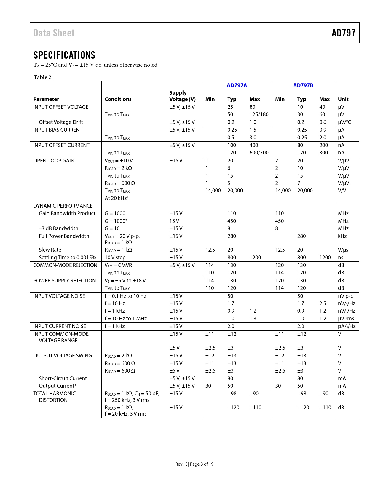Data Sheet AD797 SPECIFICATIONS Table 2 AD797A AD797B Supply Parameter Conditions Voltage (V) Min Typ Max Min Typ Max Unit