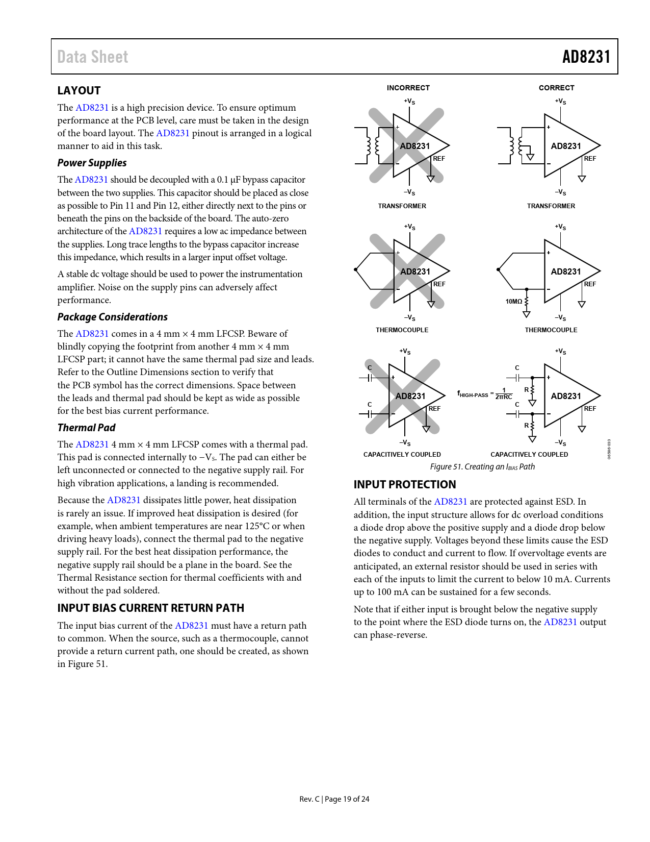 link to page 23 link to page 7 link to page 19 Data SheetAD8231LAYOUTINCORRECTCORRECT+VS+VS The AD8231 is a high precision device. To ensure optimum performance at the PCB level, care must be taken in the design of the board layout. The AD8231 pinout is arranged in a logical manner to aid in this task. AD8231AD8231REFREFPower Supplies The AD8231 should be decoupled with a 0.1 μF bypass capacitor between the two supplies. This capacitor should be placed as close –VS–VS as possible to Pin 11 and Pin 12, either directly next to the pins or TRANSFORMERTRANSFORMER beneath the pins on the backside of the board. The auto-zero +V+V architecture of the AD8231 requires a low ac impedance between SS the supplies. Long trace lengths to the bypass capacitor increase this impedance, which results in a larger input offset voltage. A stable dc voltage should be used to power the instrumentation AD8231AD8231 amplifier. Noise on the supply pins can adversely affect REFREF performance. 10MΩPackage Considerations–VS–VS The AD8231 comes in a 4 mm × 4 mm LFCSP. Beware of THERMOCOUPLETHERMOCOUPLE blindly copying the footprint from another 4 mm × 4 mm +VS+VS LFCSP part; it cannot have the same thermal pad size and leads. CC Refer to the Outline Dimensions section to verify that the PCB symbol has the correct dimensions. Space between 1Rf the leads and thermal pad should be kept as wide as possible AD8231HIGH-PASS = 2πRCAD8231CC for the best bias current performance. REFREFThermal PadR The AD8231 4 mm × 4 mm LFCSP comes with a thermal pad. –V 3 S–VS -03 86 This pad is connected internally to −V CAPACITIVELY COUPLEDCAPACITIVELY COUPLED 65 S. The pad can either be 0 left unconnected or connected to the negative supply rail. For Figure 51. Creating an IBIAS Path high vibration applications, a landing is recommended. INPUT PROTECTION Because the AD8231 dissipates little power, heat dissipation All terminals of the AD8231 are protected against ESD. In is rarely an issue. If improved heat dissipation is desired (for addition, the input structure allows for dc overload conditions example, when ambient temperatures are near 125°C or when a diode drop above the positive supply and a diode drop below driving heavy loads), connect the thermal pad to the negative the negative supply. Voltages beyond these limits cause the ESD supply rail. For the best heat dissipation performance, the diodes to conduct and current to flow. If overvoltage events are negative supply rail should be a plane in the board. See the anticipated, an external resistor should be used in series with Thermal Resistance section for thermal coefficients with and each of the inputs to limit the current to below 10 mA. Currents without the pad soldered. up to 100 mA can be sustained for a few seconds. INPUT BIAS CURRENT RETURN PATH Note that if either input is brought below the negative supply The input bias current of the AD8231 must have a return path to the point where the ESD diode turns on, the AD8231 output to common. When the source, such as a thermocouple, cannot can phase-reverse. provide a return current path, one should be created, as shown in Figure 51. Rev. C | Page 19 of 24 Document Outline FEATURES APPLICATIONS FUNCTIONAL BLOCK DIAGRAM GENERAL DESCRIPTION TABLE OF CONTENTS REVISION HISTORY SPECIFICATIONS ABSOLUTE MAXIMUM RATINGS THERMAL RESISTANCE MAXIMUM POWER DISSIPATION ESD CAUTION PIN CONFIGURATION AND FUNCTION DESCRIPTIONS TYPICAL PERFORMANCE CHARACTERISTICS INSTRUMENTATION AMPLIFIER PERFORMANCE CURVES OPERATIONAL AMPLIFIER PERFORMANCE CURVES PERFORMANCE CURVES VALID FOR BOTH AMPLIFIERS THEORY OF OPERATION AMPLIFIER ARCHITECTURE GAIN SELECTION REFERENCE TERMINAL LAYOUT Power Supplies Package Considerations Thermal Pad INPUT BIAS CURRENT RETURN PATH INPUT PROTECTION RF INTERFERENCE COMMON-MODE INPUT VOLTAGE RANGE REDUCING NOISE APPLICATIONS INFORMATION DIFFERENTIAL OUTPUT MULTIPLEXING USING THE AD8231 WITH BIPOLAR SUPPLIES SALLEN KEY FILTER OUTLINE DIMENSIONS ORDERING GUIDE AUTOMOTIVE PRODUCTS