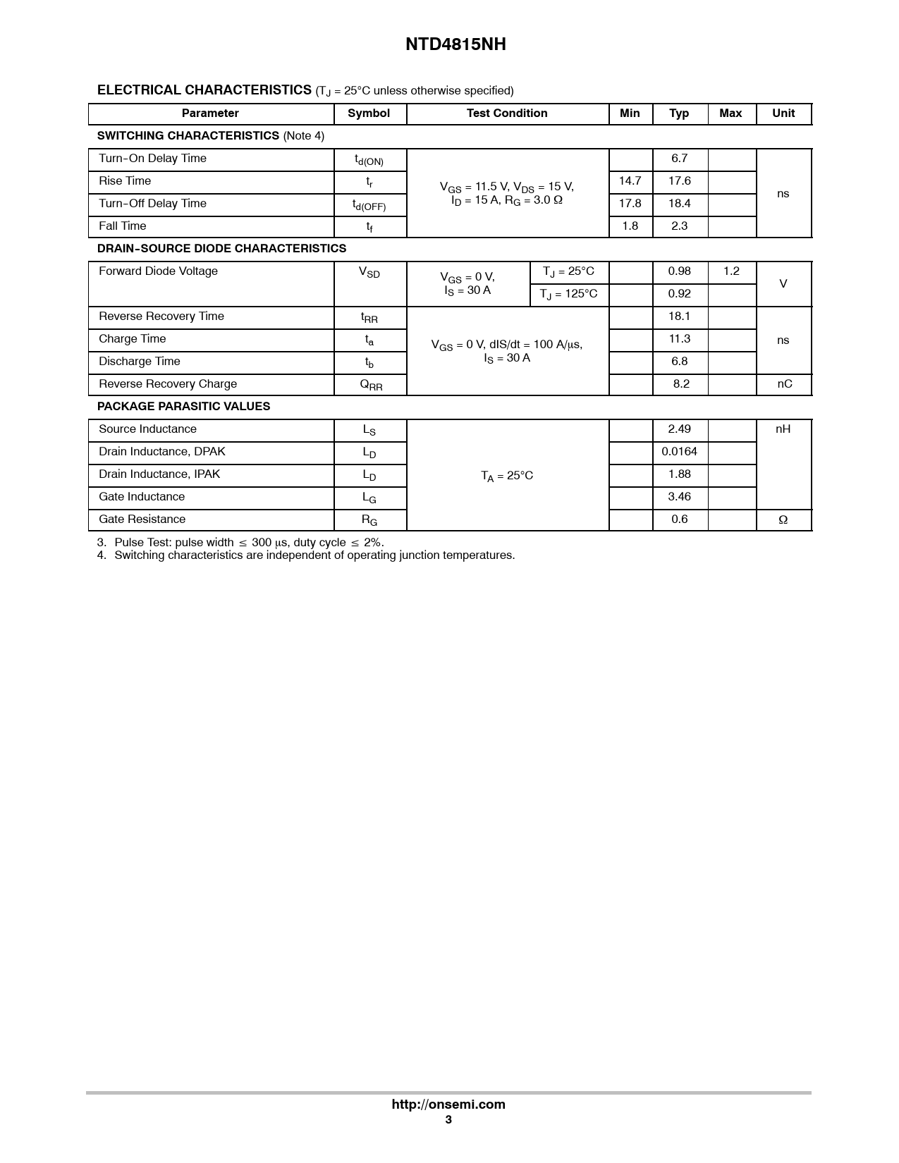 NTD4815NH. ELECTRICAL CHARACTERISTICS. Parameter. Symbol. Test Condition. Min. Typ. Max. Unit. SWITCHING CHARACTERISTICS