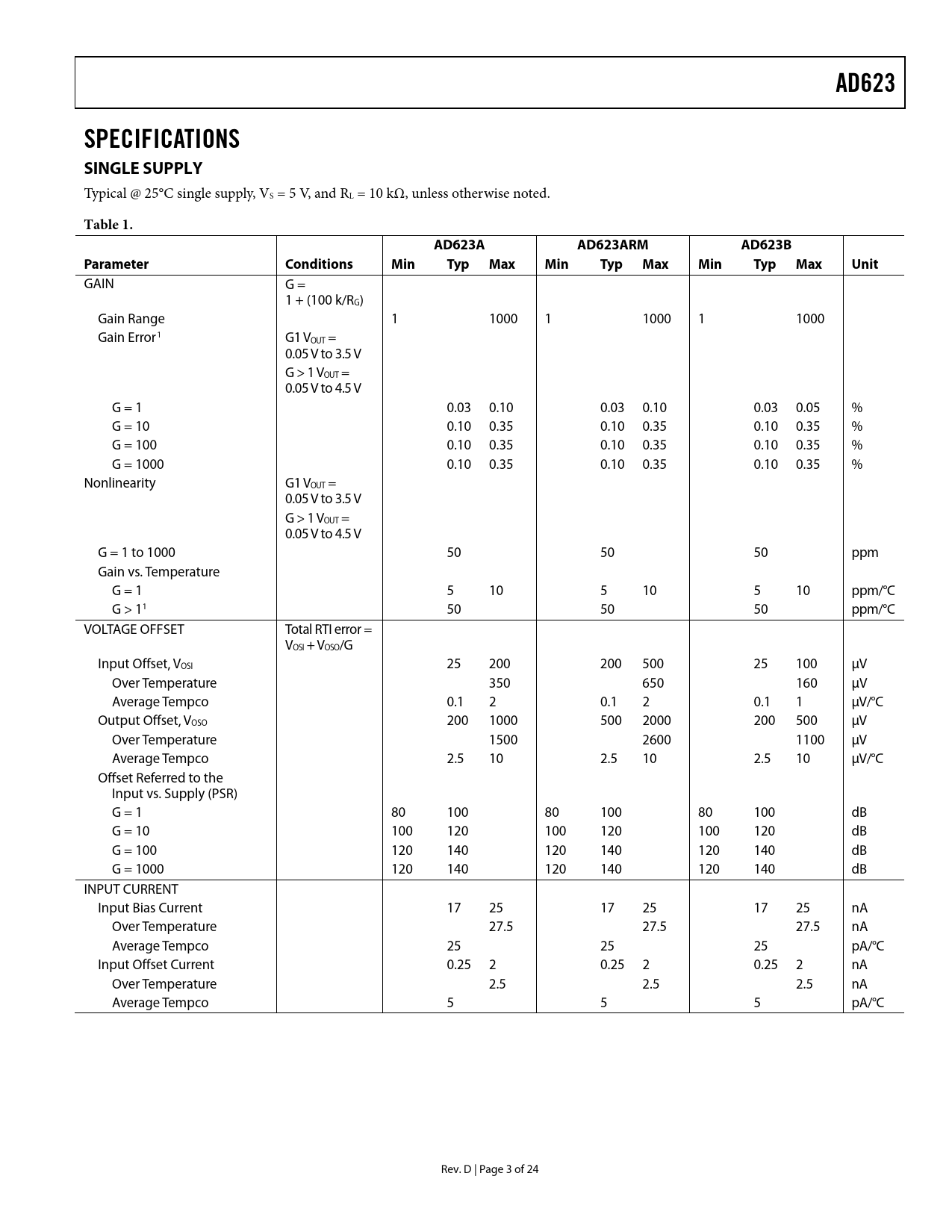 link to page 4 link to page 4 AD623SPECIFICATIONS SINGLE SUPPLY Typical @ 25°C single supply, VS = 5 V, and RL = 10 kΩ, unless otherwise noted. Table 1.AD623AAD623ARMAD623BParameterConditionsMin Typ Max Min Typ Max Min Typ Max Unit GAIN G = 1 + (100 k/RG) Gain Range 1 1000 1 1000 1 1000 Gain Error1 G1 VOUT = 0.05 V to 3.5 V G > 1 VOUT = 0.05 V to 4.5 V G = 1 0.03 0.10 0.03 0.10 0.03 0.05 % G = 10 0.10 0.35 0.10 0.35 0.10 0.35 % G = 100 0.10 0.35 0.10 0.35 0.10 0.35 % G = 1000 0.10 0.35 0.10 0.35 0.10 0.35 % Nonlinearity G1 VOUT = 0.05 V to 3.5 V G > 1 VOUT = 0.05 V to 4.5 V G = 1 to 1000 50 50 50 ppm Gain vs. Temperature G = 1 5 10 5 10 5 10 ppm/°C G > 11 50 50 50 ppm/°C VOLTAGE OFFSET Total RTI error = VOSI + VOSO/G Input Offset, VOSI 25 200 200 500 25 100 μV Over Temperature 350 650 160 μV Average Tempco 0.1 2 0.1 2 0.1 1 μV/°C Output Offset, VOSO 200 1000 500 2000 200 500 μV Over Temperature 1500 2600 1100 μV Average Tempco 2.5 10 2.5 10 2.5 10 μV/°C Offset Referred to the Input vs. Supply (PSR) G = 1 80 100 80 100 80 100 dB G = 10 100 120 100 120 100 120 dB G = 100 120 140 120 140 120 140 dB G = 1000 120 140 120 140 120 140 dB INPUT CURRENT Input Bias Current 17 25 17 25 17 25 nA Over Temperature 27.5 27.5 27.5 nA Average Tempco 25 25 25 pA/°C Input Offset Current 0.25 2 0.25 2 0.25 2 nA Over Temperature 2.5 2.5 2.5 nA Average Tempco 5 5 5 pA/°C Rev. D | Page 3 of 24 Document Outline FEATURES APPLICATIONS GENERAL DESCRIPTION CONNECTION DIAGRAM TABLE OF CONTENTS REVISION HISTORY SPECIFICATIONS SINGLE SUPPLY DUAL SUPPLIES BOTH DUAL AND SINGLE SUPPLIES ABSOLUTE MAXIMUM RATINGS ESD CAUTION TYPICAL PERFORMANCE CHARACTERISTICS THEORY OF OPERATION APPLICATIONS INFORMATION BASIC CONNECTION GAIN SELECTION REFERENCE TERMINAL INPUT AND OUTPUT OFFSET VOLTAGE INPUT PROTECTION RF INTERFERENCE GROUNDING Ground Returns for Input Bias Currents Output Buffering Single-Supply Data Acquisition System Amplifying Signals with Low Common-Mode Voltage INPUT DIFFERENTIAL AND COMMON-MODE RANGE vs. SUPPLY AND GAIN OUTLINE DIMENSIONS ORDERING GUIDE