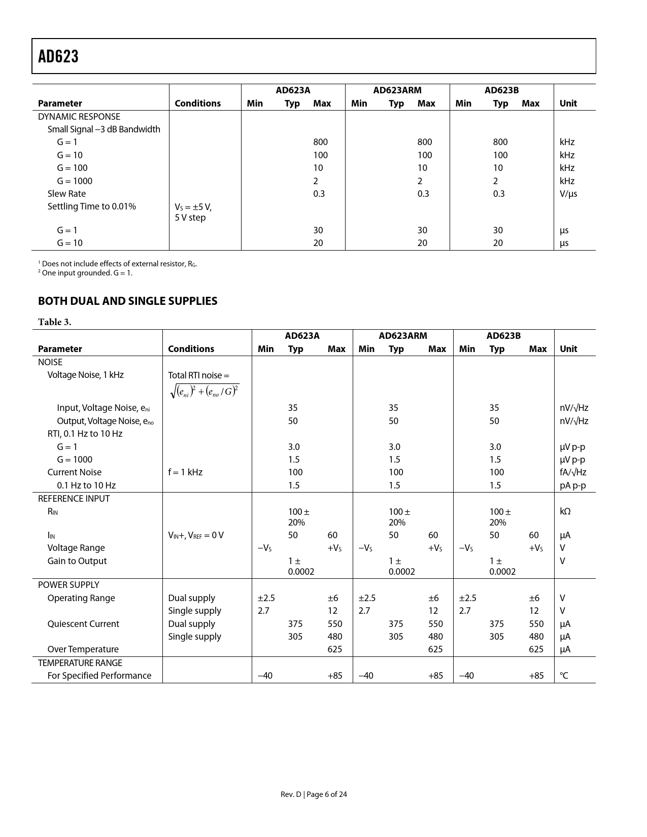 AD623AD623AAD623ARMAD623BParameterConditionsMinTypMaxMinTypMaxMinTypMaxUnit DYNAMIC RESPONSE Small Signal −3 dB Bandwidth G = 1 800 800 800 kHz G = 10 100 100 100 kHz G = 100 10 10 10 kHz G = 1000 2 2 2 kHz Slew Rate 0.3 0.3 0.3 V/μs Settling Time to 0.01% VS = ±5 V, 5 V step G = 1 30 30 30 μs G = 10 20 20 20 μs 1 Does not include effects of external resistor, RG. 2 One input grounded. G = 1. BOTH DUAL AND SINGLE SUPPLIESTable 3.AD623AAD623ARMAD623BParameterConditionsMinTypMaxMinTypMaxMinTypMaxUnit NOISE Voltage Noise, 1 kHz Total RTI noise = (e + ni )2 (e /G no )2 Input, Voltage Noise, eni 35 35 35 nV/√Hz Output, Voltage Noise, eno 50 50 50 nV/√Hz RTI, 0.1 Hz to 10 Hz G = 1 3.0 3.0 3.0 μV p-p G = 1000 1.5 1.5 1.5 μV p-p Current Noise f = 1 kHz 100 100 100 fA/√Hz 0.1 Hz to 10 Hz 1.5 1.5 1.5 pA p-p REFERENCE INPUT RIN 100 ± 100 ± 100 ± kΩ 20% 20% 20% IIN VIN+, VREF = 0 V 50 60 50 60 50 60 μA Voltage Range −VS +VS −VS +VS −VS +VS V Gain to Output 1 ± 1 ± 1 ± V 0.0002 0.0002 0.0002 POWER SUPPLY Operating Range Dual supply ±2.5 ±6 ±2.5 ±6 ±2.5 ±6 V Single supply 2.7 12 2.7 12 2.7 12 V Quiescent Current Dual supply 375 550 375 550 375 550 μA Single supply 305 480 305 480 305 480 μA Over Temperature 625 625 625 μA TEMPERATURE RANGE For Specified Performance −40 +85 −40 +85 −40 +85 °C Rev. D | Page 6 of 24 Document Outline FEATURES APPLICATIONS GENERAL DESCRIPTION CONNECTION DIAGRAM TABLE OF CONTENTS REVISION HISTORY SPECIFICATIONS SINGLE SUPPLY DUAL SUPPLIES BOTH DUAL AND SINGLE SUPPLIES ABSOLUTE MAXIMUM RATINGS ESD CAUTION TYPICAL PERFORMANCE CHARACTERISTICS THEORY OF OPERATION APPLICATIONS INFORMATION BASIC CONNECTION GAIN SELECTION REFERENCE TERMINAL INPUT AND OUTPUT OFFSET VOLTAGE INPUT PROTECTION RF INTERFERENCE GROUNDING Ground Returns for Input Bias Currents Output Buffering Single-Supply Data Acquisition System Amplifying Signals with Low Common-Mode Voltage INPUT DIFFERENTIAL AND COMMON-MODE RANGE vs. SUPPLY AND GAIN OUTLINE DIMENSIONS ORDERING GUIDE