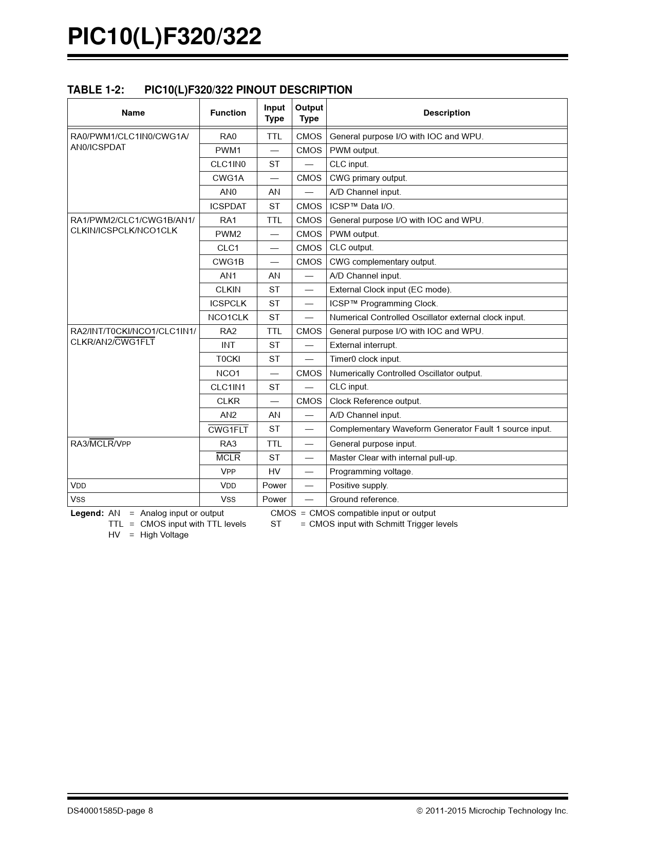 PIC10(L)F320/322. TABLE 1-2:. PIC10(L)F320/322 PINOUT. DESCRIPTION. Input Output. Name. Function. Description. Type. Legend: