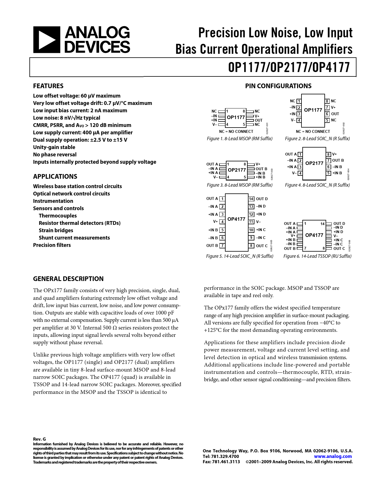 Precision Low Noise, Low Input. Bias Current Operational Amplifiers. OP1177/OP2177/OP4177. FEATURES. PIN CONFIGURATIONS