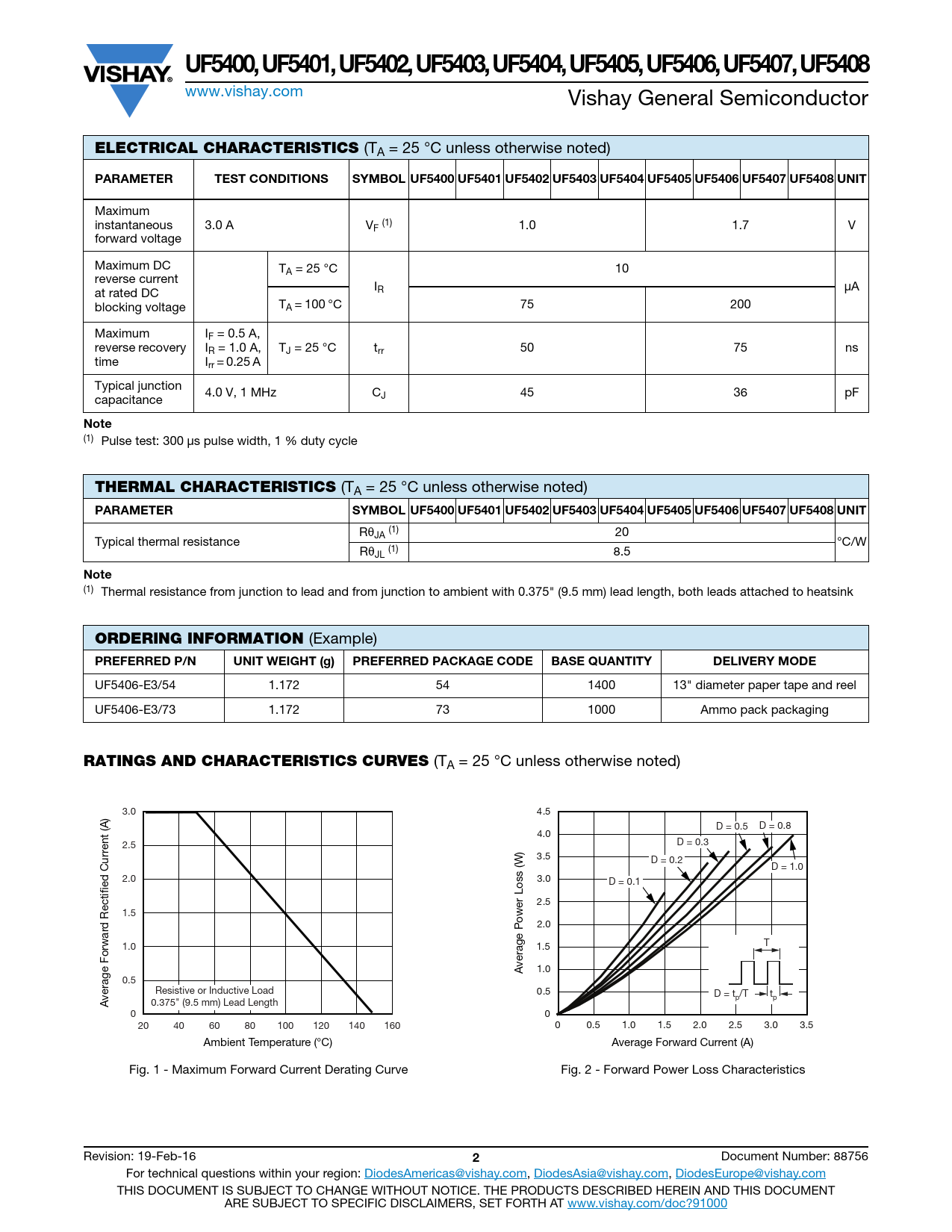UF5400, UF5401, UF5402, UF5403, UF5404, UF5405, UF5406, UF5407, UF5408 www.vishay.com Vishay General Semiconductor ELECTRICAL CHARACTERISTICS (TA = 25 °C unless otherwise noted) PARAMETER TESTCONDITIONSSYMBOL UF5400 UF5401 UF5402 UF5403 UF5404 UF5405 UF5406 UF5407 UF5408 UNIT Maximum instantaneous 3.0 A VF (1) 1.0 1.7 V forward voltage Maximum DC TA = 25 °C 10 reverse current I μA at rated DC R blocking voltage TA = 100 °C 75 200 Maximum IF = 0.5 A, reverse recovery IR = 1.0 A, TJ = 25 °C trr 50 75 ns time Irr = 0.25 A Typical junction 4.0 V, 1 MHz C capacitance J 45 36 pF Note (1) Pulse test: 300 μs pulse width, 1 % duty cycle THERMAL CHARACTERISTICS (TA = 25 °C unless otherwise noted) PARAMETERSYMBOL UF5400 UF5401 UF5402 UF5403 UF5404 UF5405 UF5406 UF5407 UF5408 UNIT RJA (1) 20 Typical thermal resistance °C/W RJL (1) 8.5 Note (1) Thermal resistance from junction to lead and from junction to ambient with 0.375" (9.5 mm) lead length, both leads attached to heatsink ORDERING INFORMATION (Example) PREFERRED P/NUNIT WEIGHT (g)PREFERRED PACKAGE CODEBASE QUANTITYDELIVERY MODE UF5406-E3/54 1.172 54 1400 13" diameter paper tape and reel UF5406-E3/73 1.172 73 1000 Ammo pack packaging RATINGS AND CHARACTERISTICS CURVES (TA = 25 °C unless otherwise noted) 3.0 4.5 D = 0.5 D = 0.8 4.0 ent (A) 2.5 D = 0.3 3.5 D = 0.2 Curr (W) D = 1.0 2.0 ss 3.0 D = 0.1 2.5 1.5 d Rectified 2.0 1.0 1.5 T erage Power Lo v A 1.0 0.5 erage Forwar Resistive or Inductive Load v 0.5 D = t /T t p p A 0.375" (9.5 mm) Lead Length 0 0 20 40 60 80 100 120 140 160 0 0.5 1.0 1.5 2.0 2.5 3.0 3.5 Ambient Temperature (°C) Average Forward Current (A) Fig. 1 - Maximum Forward Current Derating Curve Fig. 2 - Forward Power Loss Characteristics Revision: 19-Feb-16 2 Document Number: 88756 For technical questions within your region: DiodesAmericas@vishay.com, DiodesAsia@vishay.com, DiodesEurope@vishay.com THIS DOCUMENT IS SUBJECT TO CHANGE WITHOUT NOTICE. THE PRODUCTS DESCRIBED HEREIN AND THIS DOCUMENT ARE SUBJECT TO SPECIFIC DISCLAIMERS, SET FORTH AT www.vishay.com/doc?91000