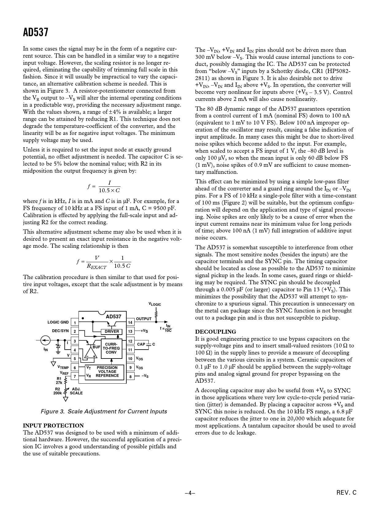 in those applications where very low cycle-to-cycle period varia- tion (jitter) is demanded. By placing a capacitor across +VS and Figure 3. Scale Adjustment for Current Inputs SYNC this noise is reduced. On the 10 kHz FS range, a 6.8 µF capacitor reduces the jitter to one in 20,000 which adequate for