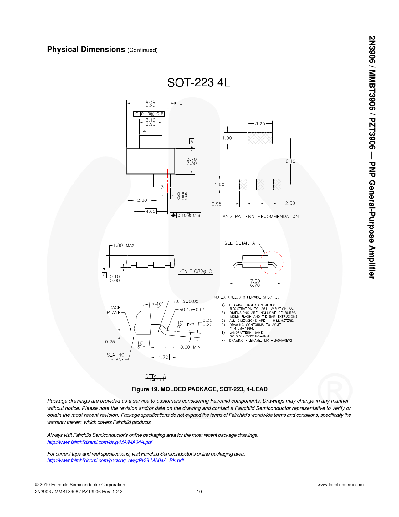 2N3906 / MMBT3906 / PZT3906 — PNP General-Purpose Amplifier Physical Dimensions (Continued) SOT-223 4L Figure 19. MOLDED PACKAGE, SOT-223, 4-LEAD