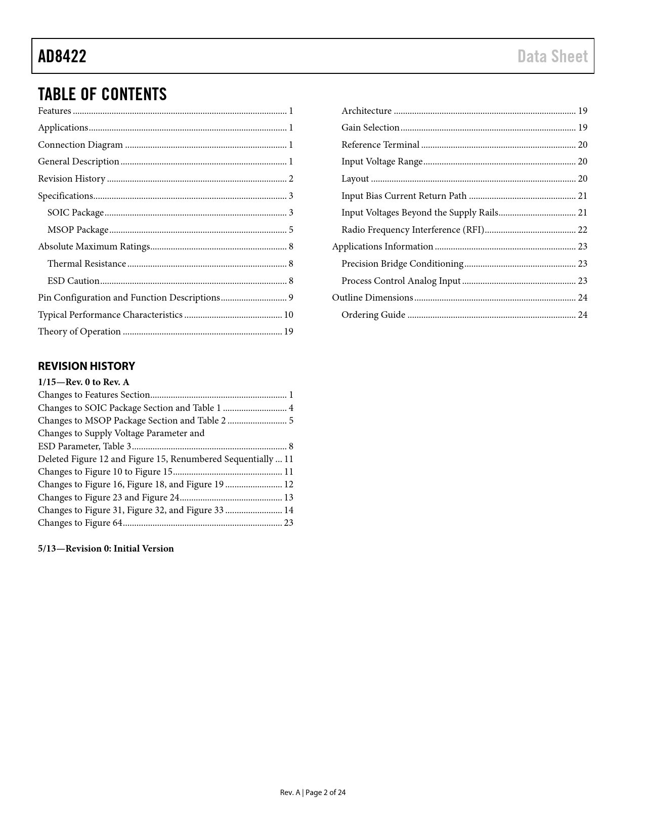 Páginas / Página24 / 2 — AD8422. Data Sheet. TABLE OF CONTENTS. REVISION HISTORY 1/15—Rev. 0 to …