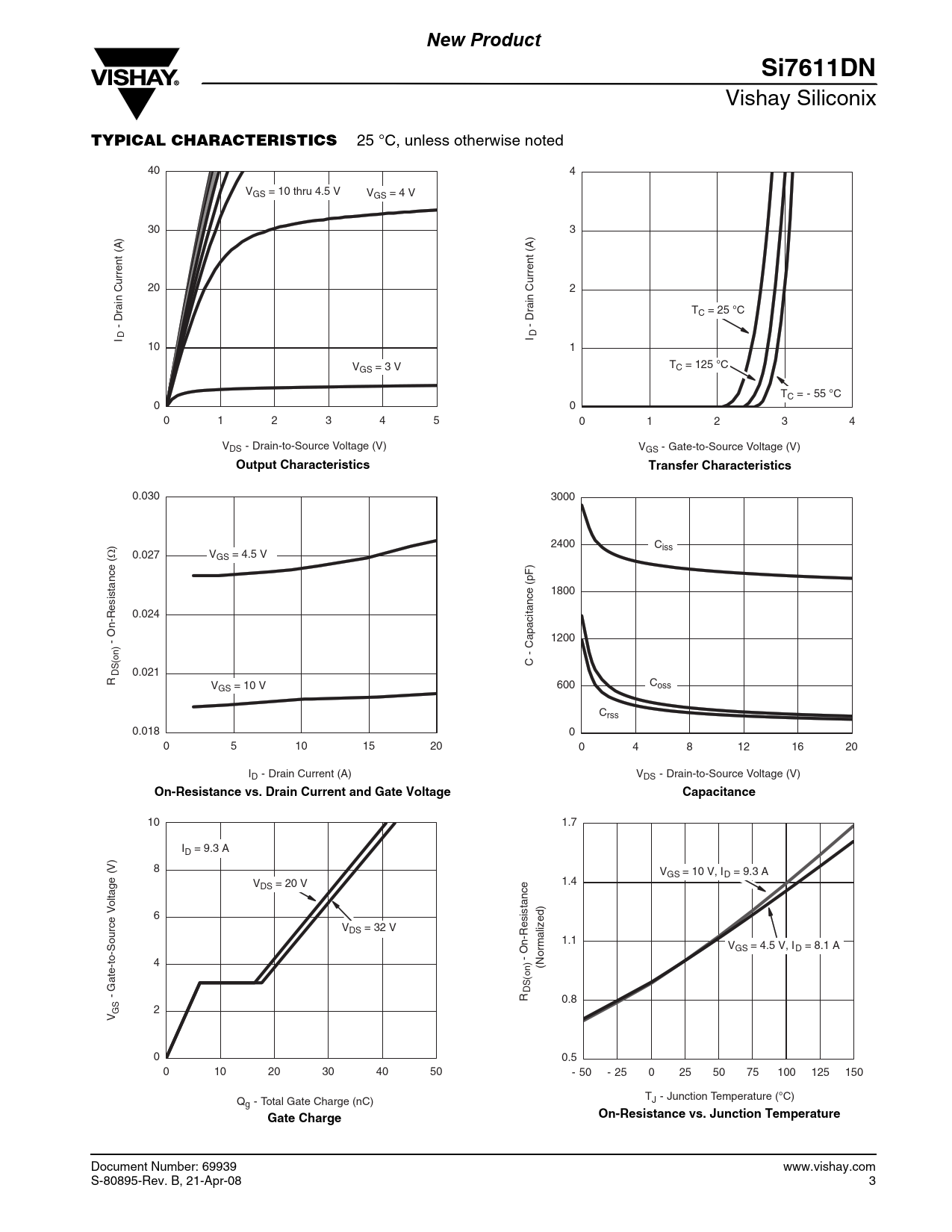 New ProductSi7611DN Vishay Siliconix TYPICAL CHARACTERISTICS 25 °C, unless otherwise noted 40 4 VGS = 10 thru 4.5 V VGS = 4 V 30 3 (A) (A) rrent rrent u u C 20 C 2 TC = 25 °C - Drain - Drain I D I D 10 1 V T GS = 3 V C = 125 °C TC = - 55 °C 0 0 0 1 2 3 4 5 0 1 2 3 4 VDS - Drain-to-Source Voltage (V) VGS - Gate-to-Source Voltage (V) Output CharacteristicsTransfer Characteristics 0.030 3000 ) 2400 Ciss 0.027 (Ω VGS = 4.5 V (pF) 1800 esistance 0.024 -R - On 1200 on) C - Capacitance DS( 0.021 R V C GS = 10 V 600 oss Crss 0.018 0 0 5 10 15 20 0 4 8 12 16 20 ID - Drain Current (A) VDS - Drain-to-Source Voltage (V) On-Resistance vs. Drain Current and Gate VoltageCapacitance 10 1.7 ID = 9.3 A ) (V 8 VGS = 10 V, ID = 9.3 A V 1.4 DS = 20 V oltage V 6 rce V esistance u DS = 32 V -R 1.1 V -So ormalized) GS = 4.5 V, ID = 8.1 A - On -to 4 (N n) DS(o - Gate R 0.8 GS 2 V 0 0.5 0 10 20 30 40 50 - 50 - 25 0 25 50 75 100 125 150 Q TJ - Junction Temperature (°C) g - Total Gate Charge (nC) Gate ChargeOn-Resistance vs. Junction Temperature Document Number: 69939 www.vishay.com S-80895-Rev. B, 21-Apr-08 3