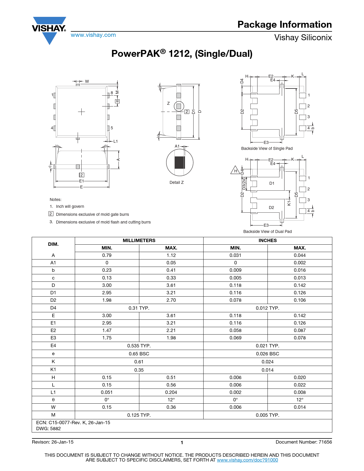 Package Information www.vishay.com Vishay Siliconix PowerPAK® 1212, (Single/Dual) L H E2 K W E4 θ D4 8 M 1 1 e Z 2 2 D1 D D2 D5 3 4 5 4 b θ L1 E3 θ θ A1 Backside View of Single Pad L A H E2 K E4 c H D4 2 1 E1 Detail Z D1 E D3(2x) 2 D2 D5 Notes: 3 K1 1. Inch will govern D2 4 b 2 Dimensions exclusive of mold gate burrs 3. Dimensions exclusive of mold flash and cutting burrs E3 Backside View of Dual Pad MILLIMETERSINCHESDIM.MIN.MAX.MIN.MAX. A 0.79 1.12 0.031 0.044 A1 0 0.05 0 0.002 b 0.23 0.41 0.009 0.016 c 0.13 0.33 0.005 0.013 D 3.00 3.61 0.118 0.142 D1 2.95 3.21 0.116 0.126 D2 1.98 2.70 0.078 0.106 D4 0.31 TYP. 0.012 TYP. E 3.00 3.61 0.118 0.142 E1 2.95 3.21 0.116 0.126 E2 1.47 2.21 0.058 0.087 E3 1.75 1.98 0.069 0.078 E4 0.535 TYP. 0.021 TYP. e 0.65 BSC 0.026 BSC K 0.61 0.024 K1 0.35 0.014 H 0.15 0.51 0.006 0.020 L 0.15 0.56 0.006 0.022 L1 0.051 0.204 0.002 0.008 θ 0° 12° 0° 12° W 0.15 0.36 0.006 0.014 M 0.125 TYP. 0.005 TYP. ECN: C15-0077-Rev. K, 26-Jan-15 DWG: 5882 Revison: 26-Jan-15 1 Document Number: 71656 THIS DOCUMENT IS SUBJECT TO CHANGE WITHOUT NOTICE. THE PRODUCTS DESCRIBED HEREIN AND THIS DOCUMENT ARE SUBJECT TO SPECIFIC DISCLAIMERS, SET FORTH AT www.vishay.com/doc?91000