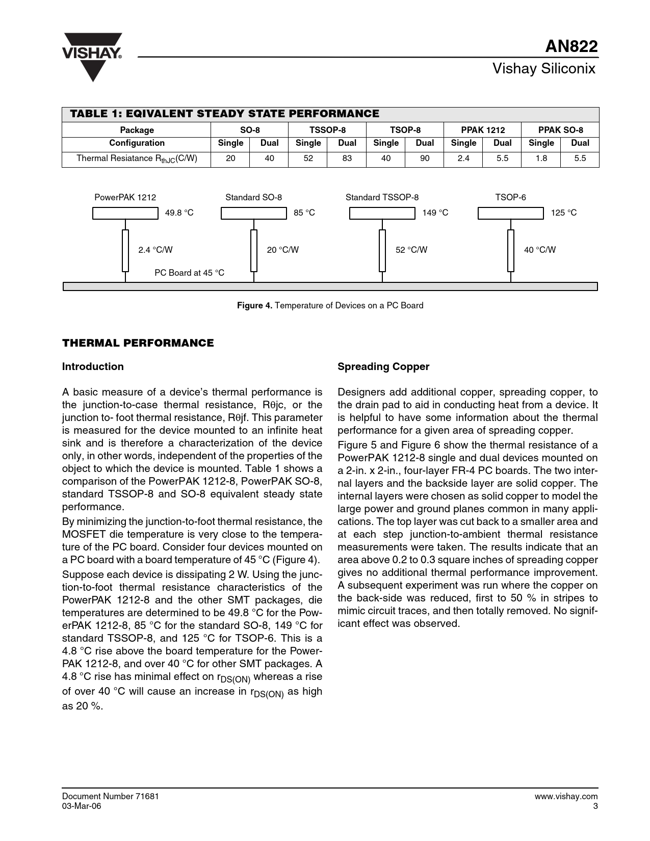 AN822 Vishay Siliconix TABLE 1: EQIVALENT STEADY STATE PERFORMANCEPackageSO-8TSSOP-8TSOP-8PPAK 1212PPAK SO-8ConfigurationSingleDualSingleDualSingleDualSingleDualSingleDual Thermal Resiatance RthJC(C/W) 20 40 52 83 40 90 2.4 5.5 1.8 5.5 PowerPAK 1212 Standard SO-8 Standard TSSOP-8 TSOP-6 49.8 °C 85 °C 149 °C 125 °C 2.4 °C/W 20 °C/W 52 °C/W 40 °C/W PC Board at 45 °C Figure 4. Temperature of Devices on a PC Board THERMAL PERFORMANCEIntroductionSpreading Copper A basic measure of a device’s thermal performance is Designers add additional copper, spreading copper, to the junction-to-case thermal resistance, Rθjc, or the the drain pad to aid in conducting heat from a device. It junction to- foot thermal resistance, Rθjf. This parameter is helpful to have some information about the thermal is measured for the device mounted to an infinite heat performance for a given area of spreading copper. sink and is therefore a characterization of the device Figure 5 and Figure 6 show the thermal resistance of a only, in other words, independent of the properties of the PowerPAK 1212-8 single and dual devices mounted on object to which the device is mounted. Table 1 shows a a 2-in. x 2-in., four-layer FR-4 PC boards. The two inter- comparison of the PowerPAK 1212-8, PowerPAK SO-8, nal layers and the backside layer are solid copper. The standard TSSOP-8 and SO-8 equivalent steady state internal layers were chosen as solid copper to model the performance. large power and ground planes common in many appli- By minimizing the junction-to-foot thermal resistance, the cations. The top layer was cut back to a smaller area and MOSFET die temperature is very close to the tempera- at each step junction-to-ambient thermal resistance ture of the PC board. Consider four devices mounted on measurements were taken. The results indicate that an a PC board with a board temperature of 45 °C (Figure 4). area above 0.2 to 0.3 square inches of spreading copper Suppose each device is dissipating 2 W. Using the junc- gives no additional thermal performance improvement. tion-to-foot thermal resistance characteristics of the A subsequent experiment was run where the copper on PowerPAK 1212-8 and the other SMT packages, die the back-side was reduced, first to 50 % in stripes to temperatures are determined to be 49.8 °C for the Pow- mimic circuit traces, and then totally removed. No signif- erPAK 1212-8, 85 °C for the standard SO-8, 149 °C for icant effect was observed. standard TSSOP-8, and 125 °C for TSOP-6. This is a 4.8 °C rise above the board temperature for the Power- PAK 1212-8, and over 40 °C for other SMT packages. A 4.8 °C rise has minimal effect on rDS(ON) whereas a rise of over 40 °C will cause an increase in rDS(ON) as high as 20 %. Document Number 71681 www.vishay.com 03-Mar-06 3