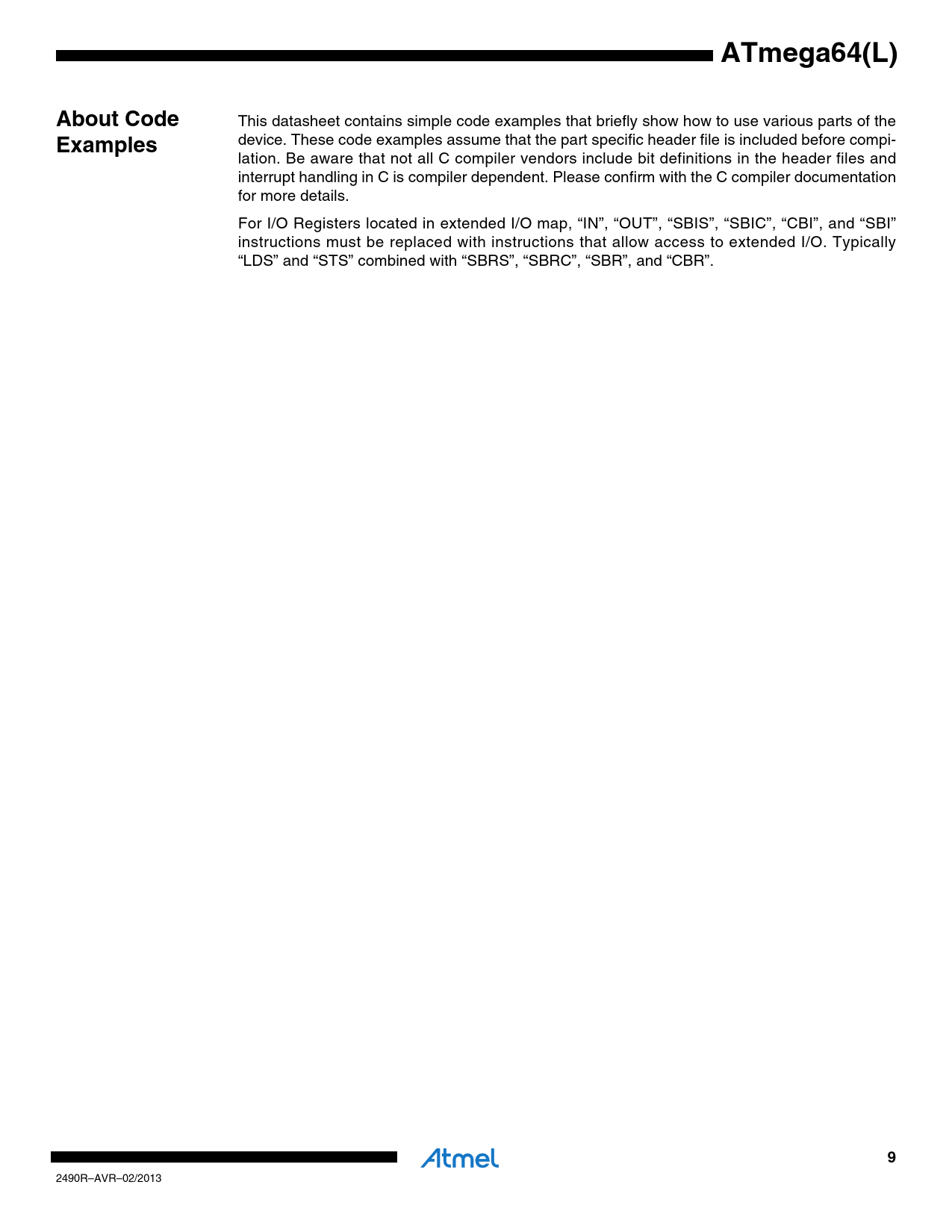ATmega64(L)About Code This datasheet contains simple code examples that briefly show how to use various parts of the Examples device. These code examples assume that the part specific header file is included before compi- lation. Be aware that not all C compiler vendors include bit definitions in the header files and interrupt handling in C is compiler dependent. Please confirm with the C compiler documentation for more details. For I/O Registers located in extended I/O map, “IN”, “OUT”, “SBIS”, “SBIC”, “CBI”, and “SBI” instructions must be replaced with instructions that allow access to extended I/O. Typically “LDS” and “STS” combined with “SBRS”, “SBRC”, “SBR”, and “CBR”. 9 2490R–AVR–02/2013 Document Outline Features Pin Configuration Disclaimer Overview Block Diagram ATmega103 and ATmega64 Compatibility ATmega103 Compatibility Mode Pin Descriptions VCC GND Port A (PA7..PA0) Port B (PB7..PB0) Port C (PC7..PC0) Port D (PD7..PD0) Port E (PE7..PE0) Port F (PF7..PF0) Port G (PG4..PG0) RESET XTAL1 XTAL2 AVCC AREF PEN Resources Data Retention About Code Examples AVR CPU Core Introduction Architectural Overview ALU – Arithmetic Logic Unit Status Register SREG – AVR Status Register General Purpose Register File X-, Y-, and Z-register Stack Pointer Instruction Execution Timing Reset and Interrupt Handling Interrupt Response Time AVR Memories In-System Reprogrammable Flash Program Memory SRAM Data Memory Data Memory Access Times EEPROM Data Memory EEPROM Read/Write Access EEARH and EEARL – EEPROM Address Register EEDR – EEPROM Data Register EECR – EEPROM Control Register EEPROM Write During Power-down Sleep Mode Preventing EEPROM Corruption I/O Memory External Memory Interface Overview ATmega103 Compatibility Using the External Memory Interface Address Latch Requirements Pull-up and Bus Keeper Timing XMEM Register Description MCUCR – MCU Control Register XMCRA – External Memory Control Register A XMCRB – External Memory Control Register B Using all Locations of External Memory Smaller than 64 Kbytes Using all 64Kbytes Locations of External Memory System Clock and Clock Options Clock Systems and their Distribution CPU Clock – clkCPU I/O Clock – clkI/O Flash Clock – clkFLASH Asynchronous Timer Clock – clkASY ADC Clock – clkADC Clock Sources XDIV – XTAL Divide Control Register Default Clock Source Crystal Oscillator Low-frequency Crystal Oscillator External RC Oscillator Calibrated Internal RC Oscillator OSCCAL – Oscillator Calibration Register(1) External Clock Timer/Counter Oscillator Power Management and Sleep Modes MCUCR – MCU Control Register Idle Mode ADC Noise Reduction Mode Power-down Mode Power-save Mode Standby Mode Extended Standby Mode Minimizing Power Consumption Analog to Digital Converter Analog Comparator Brown-out Detector Internal Voltage Reference Watchdog Timer Port Pins JTAG Interface and On-chip Debug System System Control and Reset Resetting the AVR Reset Sources Power-on Reset External Reset Brown-out Detection Watchdog Reset MCUCSR – MCU Control and Status Register(1) Internal Voltage Reference Voltage Reference Enable Signals and Start-up Time Watchdog Timer WDTCR – Watchdog Timer Control Register Timed Sequences for Changing the Configuration of the Watchdog Timer Safety Level 0 Safety Level 1 Safety Level 2 Interrupts Interrupt Vectors in ATmega64 Moving Interrupts Between Application and Boot Space MCUCR – MCU Control Register I/O Ports Introduction Ports as General Digital I/O Configuring the Pin Reading the Pin Value Digital Input Enable and Sleep Modes Unconnected Pins Alternate Port Functions SFIOR – Special Function IO Register Alternate Functions of Port A Alternate Functions of Port B Alternate Functions of Port C Alternate Functions of Port D Alternate Functions of Port E Alternate Functions of Port F Alternate Functions of Port G Register Description for I/O Ports PORTA – Port A Data Register DDRA – Port A Data Direction Register PINA – Port A Input Pins Address PORTB – Port B Data Register DDRB – Port B Data Direction Register PINB – Port B Input Pins Address PORTC – Port C Data Register DDRC – Port C Data Direction Register PINC – Port C Input Pins Address PORTD – Port D Data Register DDRD – Port D Data Direction Register PIND – Port D Input Pins Address PORTE – Port E Data Register DDRE – Port E Data Direction Register PINE – Port E Input Pins Address PORTF – Port F Data Register DDRF – Port F Data Direction Register PINF – Port F Input Pins Address PORTG – Port G Data Register DDRG – Port G Data Direction Register PING – Port G Input Pins Address External Interrupts EICRA – External Interrupt Control Register A EICRB – External Interrupt Control Register B EIMSK – External Interrupt Mask Register EIFR – External Interrupt Flag Register 8-bit Timer/Counter0 with PWM and Asynchronous Operation Overview Registers Definitions Timer/Counter Clock Sources Counter Unit Output Compare Unit Force Output Compare Compare Match Blocking by TCNT0 Write Using the Output Compare Unit Compare Match Output Unit Compare Output Mode and Waveform Generation Modes of Operation Normal Mode Clear Timer on Compare Match (CTC) Mode Fast PWM Mode Phase Correct PWM Mode Timer/Counter Timing Diagrams 8-bit Timer/Counter Register Description TCCR0 – Timer/Counter Control Register TCNT0 – Timer/Counter Register OCR0 – Output Compare Register Asynchronous Operation of the Timer/Counter ASSR – Asynchronous Status Register Asynchronous Operation of Timer/Counter0 TIMSK – Timer/Counter Interrupt Mask Register TIFR – Timer/Counter Interrupt Flag Register Timer/Counter Prescaler SFIOR – Special Function IO Register 16-bit Timer/Counter (Timer/Counter 1 and Timer/Counter3 ) Restrictions in ATmega103 Compatibility Mode Overview Registers Definitions Compatibility Accessing 16-bit Registers Reusing the Temporary High Byte Register Timer/Count