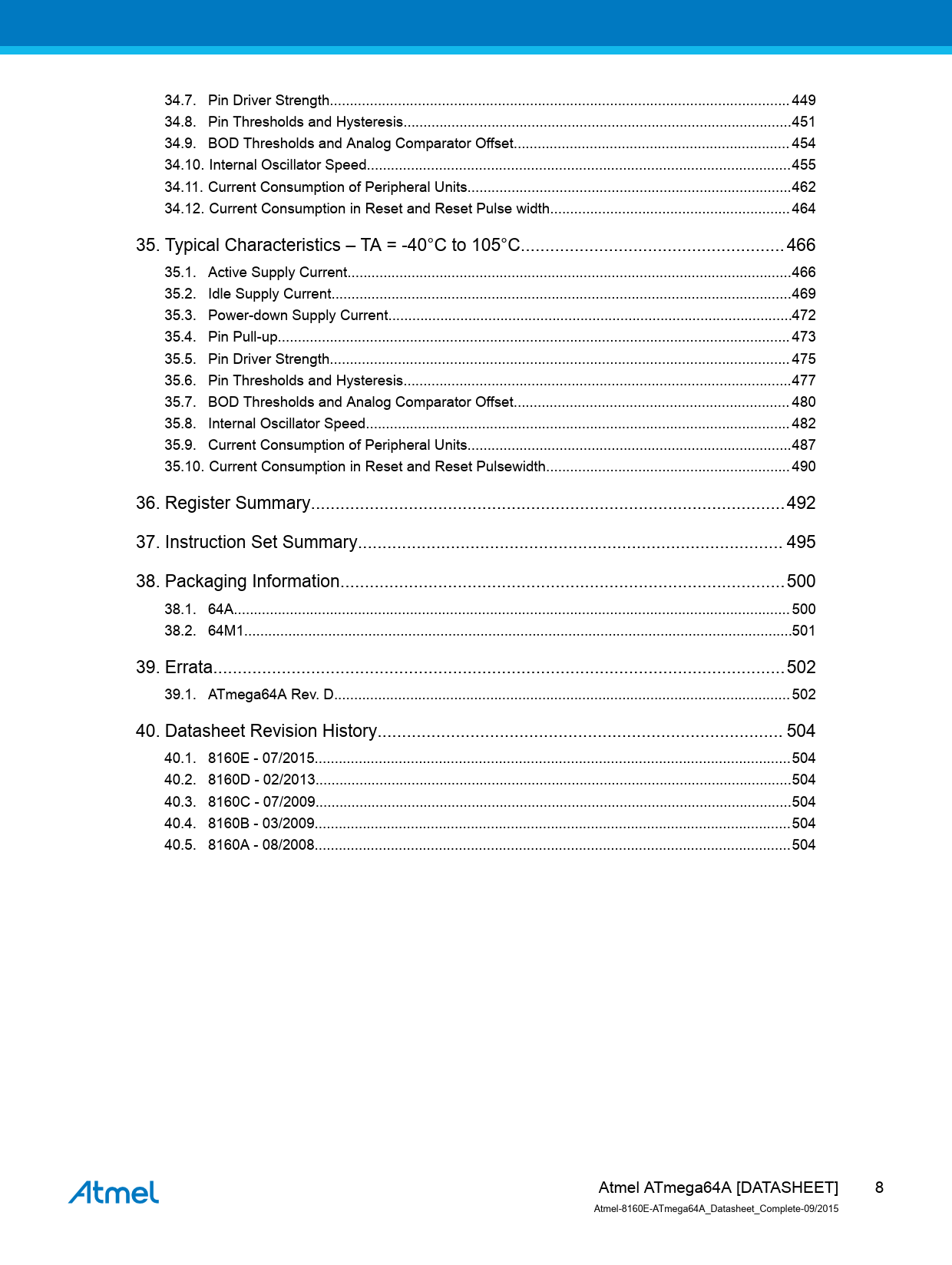 link to page 449 link to page 451 link to page 454 link to page 455 link to page 462 link to page 464 link to page 466 link to page 466 link to page 469 link to page 472 link to page 473 link to page 475 link to page 477 link to page 480 link to page 482 link to page 487 link to page 490 link to page 492 link to page 495 link to page 500 link to page 500 link to page 501 link to page 502 link to page 502 link to page 504 link to page 504 link to page 504 link to page 504 link to page 504 link to page 504 34.7. Pin Driver Strength... 449 34.8. Pin Thresholds and Hysteresis...451 34.9. BOD Thresholds and Analog Comparator Offset... 454 34.10. Internal Oscillator Speed..455 34.11. Current Consumption of Peripheral Units...462 34.12. Current Consumption in Reset and Reset Pulse width.. 464 35. Typical Characteristics – TA = -40°C to 105°C.. 466 35.1. Active Supply Current...466 35.2. Idle Supply Current...469 35.3. Power-down Supply Current...472 35.4. Pin Pull-up.. 473 35.5. Pin Driver Strength... 475 35.6. Pin Thresholds and Hysteresis...477 35.7. BOD Thresholds and Analog Comparator Offset... 480 35.8. Internal Oscillator Speed.. 482 35.9. Current Consumption of Peripheral Units...487 35.10. Current Consumption in Reset and Reset Pulsewidth... 490 36. Register Summary...492 37. Instruction Set Summary... 495 38. Packaging Information...500 38.1. 64A... 500 38.2. 64M1...501 39. Errata...502 39.1. ATmega64A Rev. D.. 502 40. Datasheet Revision History... 504 40.1. 8160E - 07/2015...504 40.2. 8160D - 02/2013...504 40.3. 8160C - 07/2009...504 40.4. 8160B - 03/2009...504 40.5. 8160A - 08/2008...504 Atmel ATmega64A [DATASHEET] 8 Atmel-8160E-ATmega64A_Datasheet_Complete-09/2015 Document Outline Introduction Features Table of Contents 1. Description 2. Configuration Summary 3. Ordering Information 4. Block Diagram 5. ATmega103 and ATmega64A Compatibility 5.1. ATmega103 Compatibility Mode 6. Pin Configurations 6.1. Pin Descriptions 6.1.1. VCC 6.1.2. GND 6.1.3. Port A (PA7:PA0) 6.1.4. Port B (PB7:PB0) 6.1.5. Port C (PC7:PC0) 6.1.6. Port D (PD7:PD0) 6.1.7. Port E (PE7:PE0) 6.1.8. Port F (PF7:PF0) 6.1.9. Port G (PG4:PG0) 6.1.10. RESET 6.1.11. XTAL1 6.1.12. XTAL2 6.1.13. AVCC 6.1.14. AREF 6.1.15. PEN 7. Resources 8. Data Retention 9. About Code Examples 10. Capacitive Touch Sensing 11. AVR CPU Core 11.1. Overview 11.2. ALU – Arithmetic Logic Unit 11.3. Status Register 11.3.1. SREG – The AVR Status Register 11.4. General Purpose Register File 11.4.1. The X-register, Y-register and Z-register 11.5. Stack Pointer 11.6. Instruction Execution Timing 11.7. Reset and Interrupt Handling 11.7.1. Interrupt Response Time 12. AVR Memories 12.1. Overview 12.2. In-System Reprogrammable Flash Program Memory 12.3. SRAM Data Memory 12.3.1. Data Memory Access Times 12.4. EEPROM Data Memory 12.4.1. EEPROM Read/Write Access 12.4.2. EEPROM Write during Power-down Sleep Mode 12.4.3. Preventing EEPROM Corruption 12.5. I/O Memory 12.6. External Memory Interface 12.6.1. Features 12.6.2. Overview 12.6.3. ATmega103 Compatibility 12.6.4. Using the External Memory Interface 12.6.5. Address Latch Requirements 12.6.6. Pull-up and Bus-keeper 12.6.7. Timing 12.6.8. Using all Locations of External Memory Smaller than 64 Kbytes 12.6.9. Using all 64 Kbytes Locations of External Memory 12.7. Register Description 12.7.1. EEARL – The EEPROM Address Register Low 12.7.2. EEARH – The EEPROM Address Register High 12.7.3. EEDR – The EEPROM Data Register 12.7.4. EECR – The EEPROM Control Register 12.7.5. MCUCR – MCU Control Register 12.7.6. XMCRA – External Memory Control Register A 12.7.7. XMCRB – External Memory Control Register B 13. System Clock and Clock Options 13.1. Clock Systems and their Distribution 13.1.1. CPU Clock – clkCPU 13.1.2. I/O Clock – clkI/O 13.1.3. Flash Clock – clkFLASH 13.1.4. Asynchronous Timer Clock – clkASY 13.1.5. ADC Clock – clkADC 13.2. Clock Sources 13.3. Default Clock Source 13.4. Crystal Oscillator 13.5. Low-frequency Crystal Oscillator 13.6. External RC Oscillator 13.7. Calibrated Internal RC Oscillator 13.8. External Clock 13.9. Timer/Counter Oscillator 13.10. Register Description 13.10.1. XDIV – XTAL Divide Control Register 13.10.2. OSCCAL – The Oscillator Calibration Register 14. Power Management and Sleep Modes 14.1. Sleep Modes 14.2. Idle Mode 14.3. ADC Noise Reduction Mode 14.4. Power-down Mode 14.5. Power-save Mode 14.6. Standby Mode 14.7. Extended Standby Mode 14.8. Minimizing Power Consumption 14.8.1. Analog-to-Digital Converter (ADC) 14.8.2. Analog Comparator 14.8.3. Brown-out Detector 14.8.4. Internal Voltage Reference 14.8.5. Watchdog Timer 14.8.6. Port Pins 14.8.7. JTAG Interface and On-chip Debug System 14.9. Register Description 14.9.1. MCUCR – MCU Control Register 15. System Control and Reset 15.1. Resetting the AVR 15.2. Reset Sources 15.2.1. Power-on Reset 15.2.2. External Reset 15.2.3. Brown-out Detection 15.2.4. Watchdog Reset 15.3. Internal Voltage Reference 15.3.1. Voltage Reference Enable Signals and Start-up Time 15.4. Watchdog Timer 15.5. Timed Sequences for Changing the Configuration of the Watchdog Timer 15.5.1. Safety Level 0 15.5.2. Safety Level 1 15.5.3. Safety Level 2 15.6. Register Description 15.6.1. MCUCSR – MCU Control and Status Register 15.6.2. WDTCR – Watchdog Timer Control Register 16. Interrupts 16.1. Interrupt Vectors in ATmega64A 16.1.1. Moving Interrupts Between Application and Boot Space 16.2. Register Description 16.2.1. MCUCR – MCU Control Register 17. External Interrupts 17.1. Register Description 17.1.1. EICRA – External Interrupt Control Register A 17.1.2. EICRB – External Interrupt Control Register B 17.1.3. EIMSK – External Interrupt Mask Register 17.1.4. EIFR – External Interrupt Flag Register 18. I/O Ports 18.1. Overview 18.2. Ports as General Digital I/O 18.2.1. Configuring the