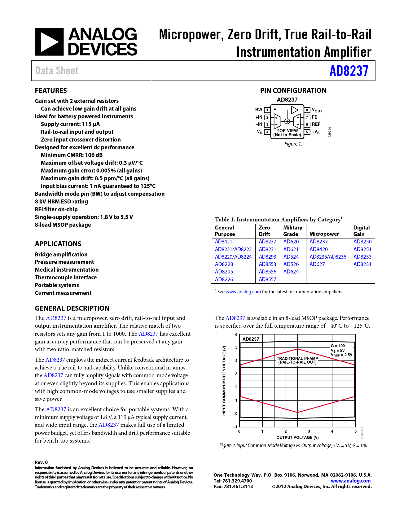 The AD8237 is a micropower, zero drift, rail-to-rail input and The AD8237 is available in an 8-lead MSOP package. Performance output instrumentation amplifier. The relative match of two is specified over the ful temperature range of −40°C to +125°C. resistors sets any gain from 1 to 1000. The AD8237 has excellent