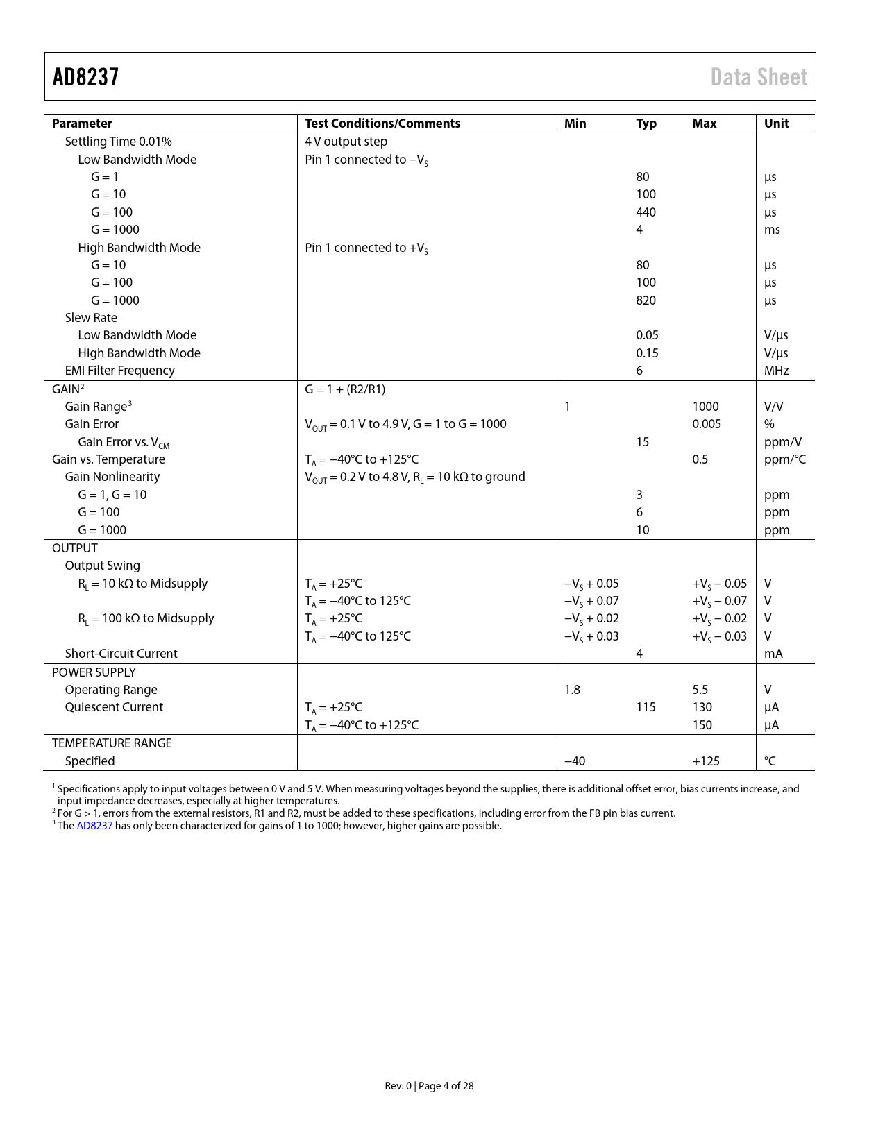 Páginas / Página28 / 4 — AD8237. Data Sheet. Parameter. Test Conditions/Comments. Min. Typ. Max. …