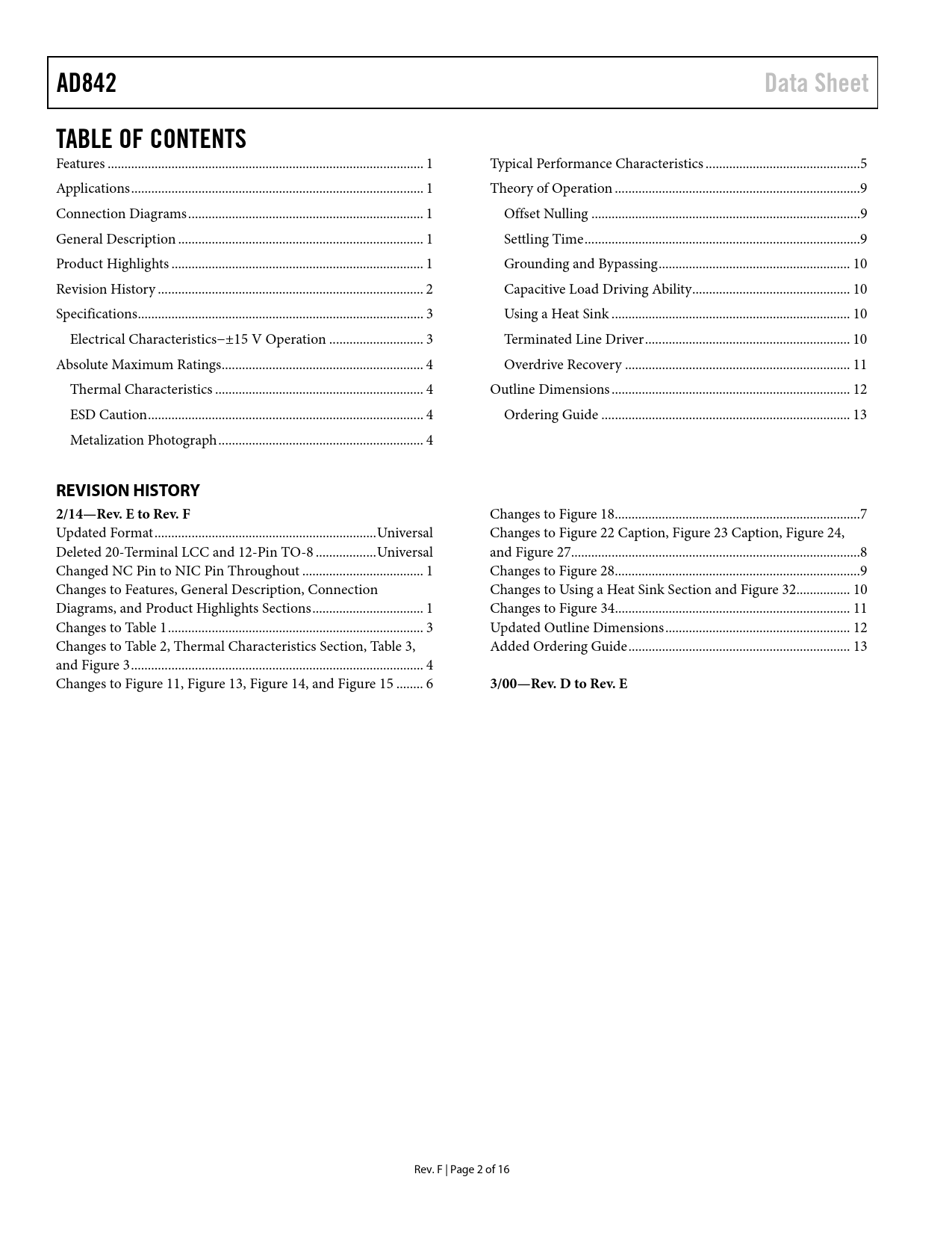 Páginas / Página16 / 2 — AD842. Data Sheet. TABLE OF CONTENTS. REVISION HISTORY 2/14—Rev. E to …