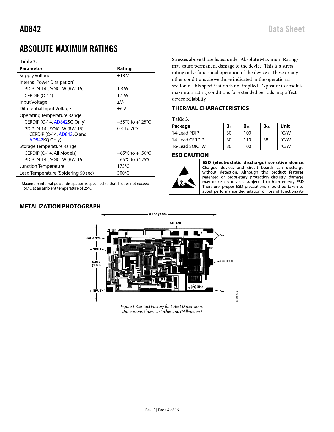 AD842 Data Sheet ABSOLUTE MAXIMUM RATINGS Table 2 Parameter Rating THERMAL CHARACTERISTICS Table 3 Package θJC θJA θSA Unit
