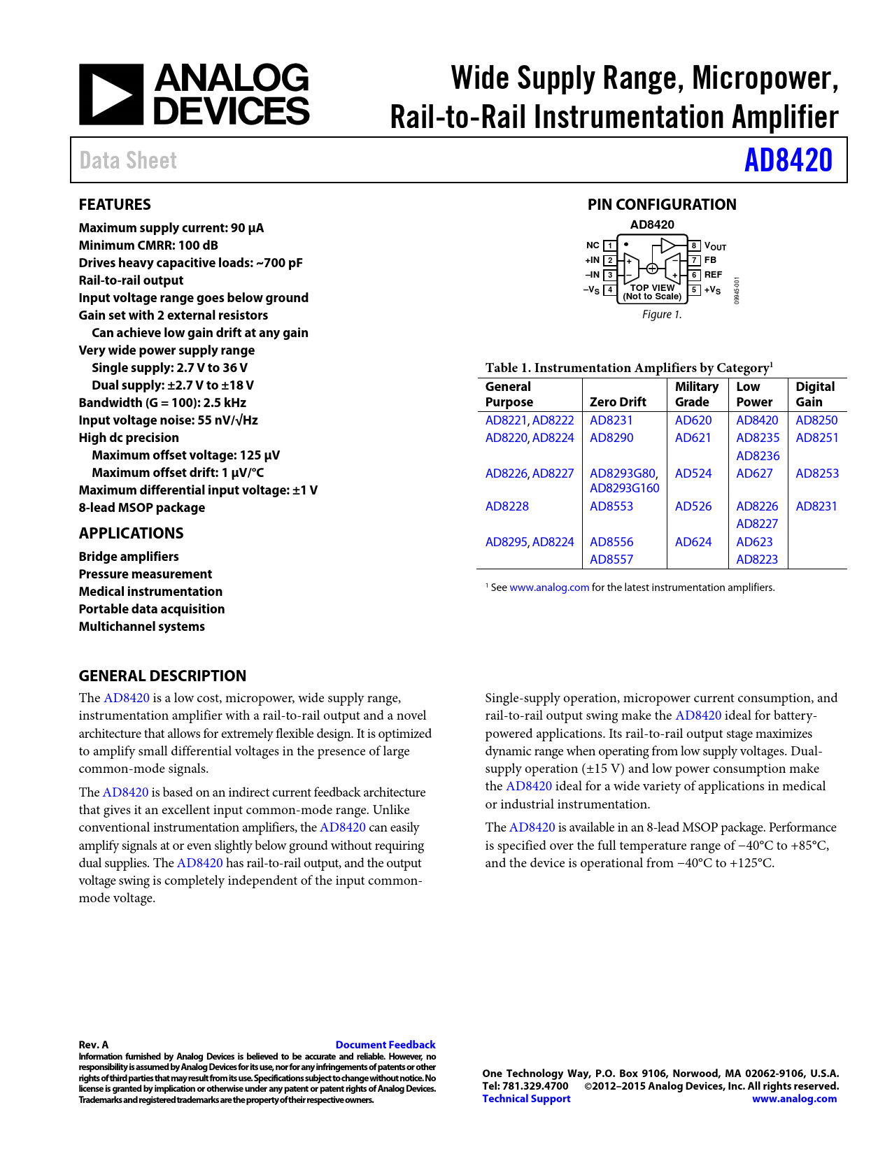 Wide Supply Range, Micropower,. Rail-to-Rail Instrumentation Amplifier. Data Sheet. AD8420. FEATURES. PIN CONFIGURATION