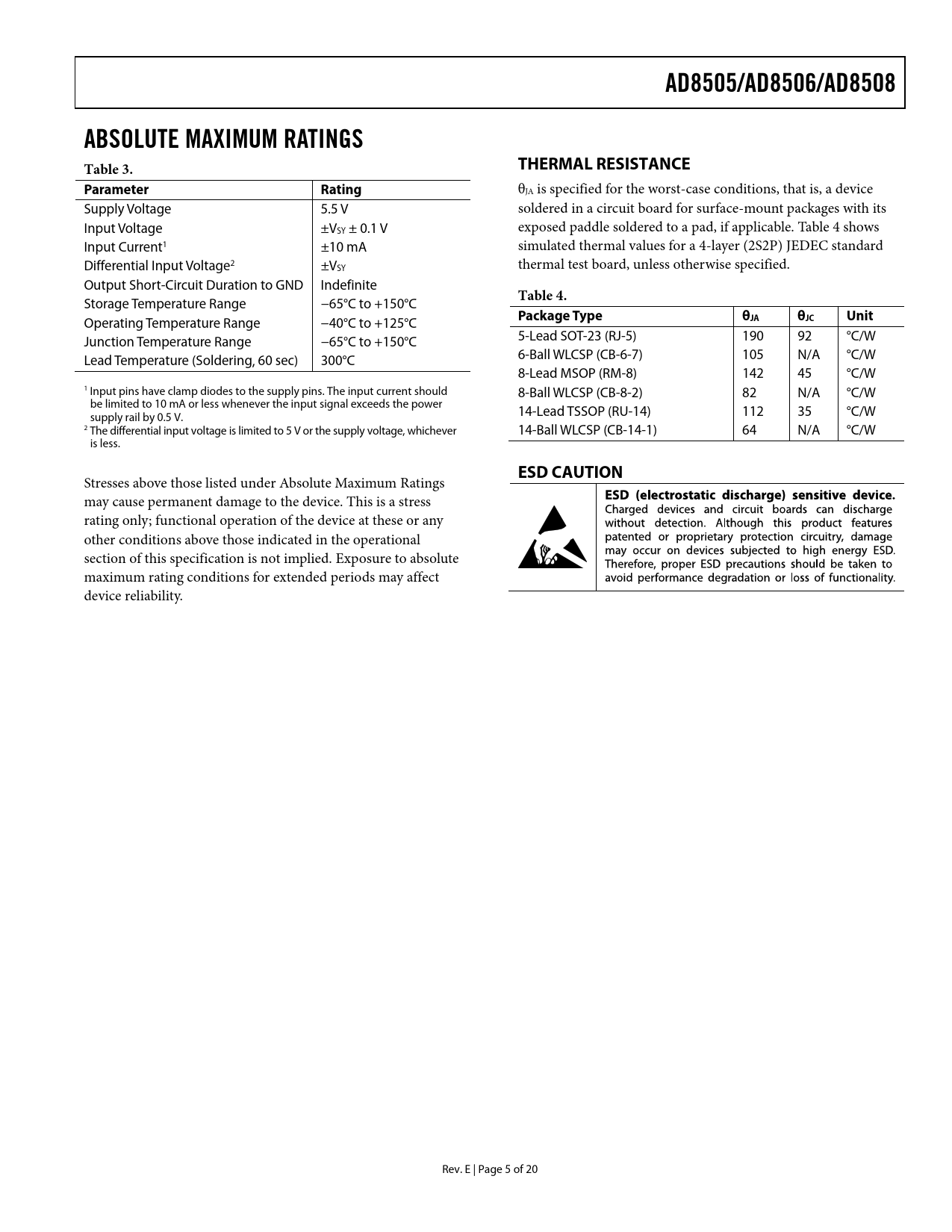 link to page 5 link to page 5 link to page 5 AD8505/AD8506/AD8508ABSOLUTE MAXIMUM RATINGS Table 3.THERMAL RESISTANCEParameter Rating θJA is specified for the worst-case conditions, that is, a device Supply Voltage 5.5 V soldered in a circuit board for surface-mount packages with its Input Voltage ±VSY ± 0.1 V exposed paddle soldered to a pad, if applicable. Table 4 shows Input Current1 ±10 mA simulated thermal values for a 4-layer (2S2P) JEDEC standard Differential Input Voltage2 ±VSY thermal test board, unless otherwise specified. Output Short-Circuit Duration to GND Indefinite Table 4. Storage Temperature Range −65°C to +150°C Package Typeθ Operating Temperature Range −40°C to +125°C JAθJC Unit Junction Temperature Range −65°C to +150°C 5-Lead SOT-23 (RJ-5) 190 92 °C/W Lead Temperature (Soldering, 60 sec) 300°C 6-Ball WLCSP (CB-6-7) 105 N/A °C/W 8-Lead MSOP (RM-8) 142 45 °C/W 1 Input pins have clamp diodes to the supply pins. The input current should 8-Ball WLCSP (CB-8-2) 82 N/A °C/W be limited to 10 mA or less whenever the input signal exceeds the power 14-Lead TSSOP (RU-14) 112 35 °C/W supply rail by 0.5 V. 2 The differential input voltage is limited to 5 V or the supply voltage, whichever 14-Ball WLCSP (CB-14-1) 64 N/A °C/W is less. ESD CAUTION Stresses above those listed under Absolute Maximum Ratings may cause permanent damage to the device. This is a stress rating only; functional operation of the device at these or any other conditions above those indicated in the operational section of this specification is not implied. Exposure to absolute maximum rating conditions for extended periods may affect device reliability. Rev. E | Page 5 of 20 Document Outline FEATURES APPLICATIONS GENERAL DESCRIPTION PIN CONFIGURATIONS TABLE OF CONTENTS REVISION HISTORY SPECIFICATIONS ELECTRICAL CHARACTERISTICS—1.8 V OPERATION ELECTRICAL CHARACTERISTICS—5 V OPERATION ABSOLUTE MAXIMUM RATINGS THERMAL RESISTANCE ESD CAUTION TYPICAL PERFORMANCE CHARACTERISTICS THEORY OF OPERATION APPLICATIONS INFORMATION PULSE OXIMETER CURRENT SOURCE FOUR-POLE, LOW-PASS BUTTERWORTH FILTER FOR GLUCOSE MONITOR OUTLINE DIMENSIONS ORDERING GUIDE