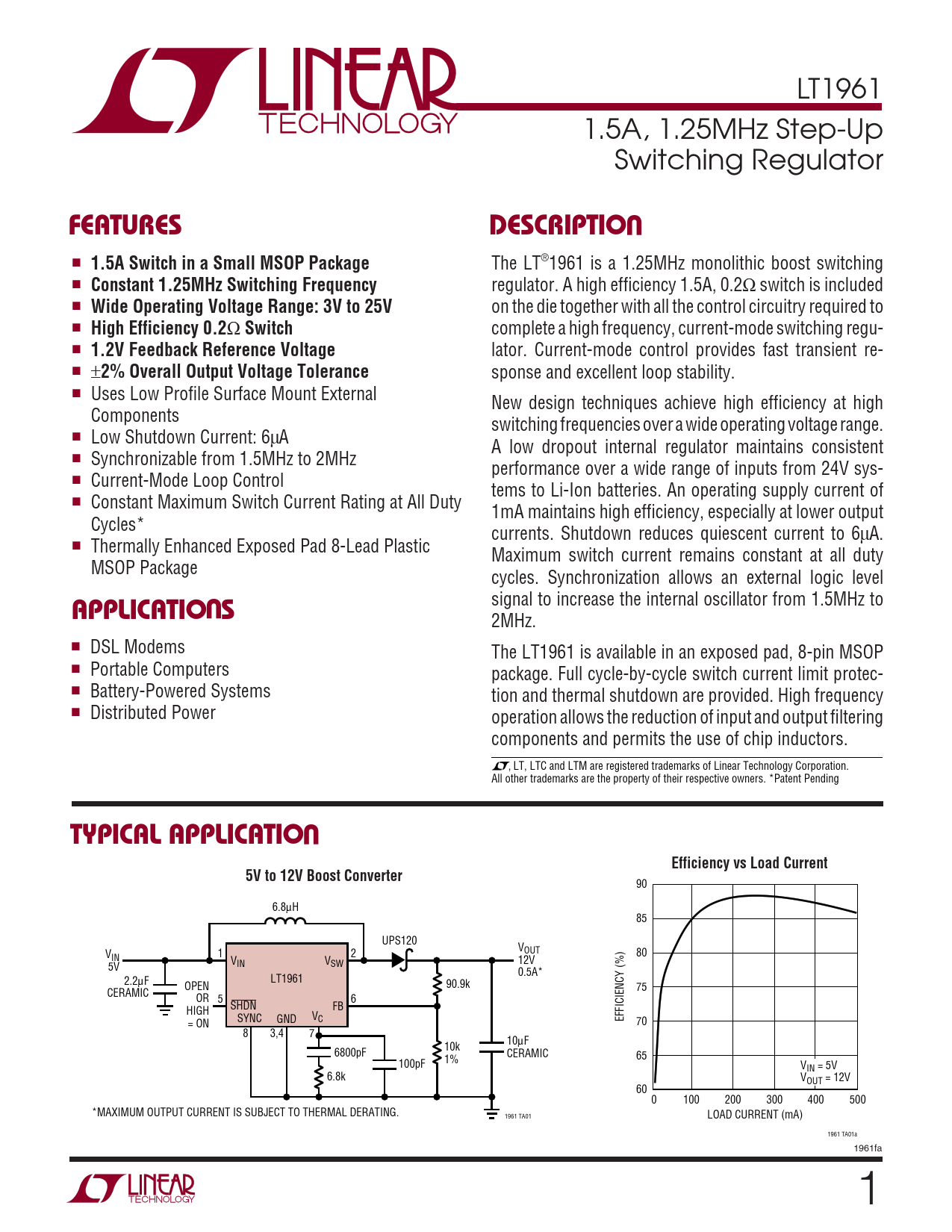 LT1961 1.5A, 1.25MHz Step-Up Switching Regulator UFEATURESDESCRIPTIO ■ 1.5A Switch in a Small MSOP Package The LT®1961 is a 1.25MHz monolithic boost switching ■ Constant 1.25MHz Switching Frequency regulator. A high efficiency 1.5A, 0.2Ω switch is included ■ Wide Operating Voltage Range: 3V to 25V on the die together with all the control circuitry required to ■ High Efficiency 0.2 Ω Switch complete a high frequency, current-mode switching regu- ■ 1.2V Feedback Reference Voltage lator. Current-mode control provides fast transient re- ■ ± 2% Overall Output Voltage Tolerance sponse and excellent loop stability. ■ Uses Low Profile Surface Mount External New design techniques achieve high efficiency at high Components switching frequencies over a wide operating voltage range. ■ Low Shutdown Current: 6μA A low dropout internal regulator maintains consistent ■ Synchronizable from 1.5MHz to 2MHz performance over a wide range of inputs from 24V sys- ■ Current-Mode Loop Control tems to Li-Ion batteries. An operating supply current of ■ Constant Maximum Switch Current Rating at All Duty 1mA maintains high efficiency, especially at lower output Cycles* currents. Shutdown reduces quiescent current to 6μA. ■ Thermally Enhanced Exposed Pad 8-Lead Plastic Maximum switch current remains constant at all duty MSOP Package cycles. Synchronization allows an external logic level UAPPLICATIO S signal to increase the internal oscillator from 1.5MHz to 2MHz. ■ DSL Modems The LT1961 is available in an exposed pad, 8-pin MSOP ■ Portable Computers package. Full cycle-by-cycle switch current limit protec- ■ Battery-Powered Systems tion and thermal shutdown are provided. High frequency ■ Distributed Power operation allows the reduction of input and output filtering components and permits the use of chip inductors. , LT, LTC and LTM are registered trademarks of Linear Technology Corporation. All other trademarks are the property of their respective owners. *Patent Pending UTYPICAL APPLICATIOEfficiency vs Load Current5V to 12V Boost Converter 90 6.8μH 85 UPS120 VOUT V 80 IN 1 2 VIN V 12V 5V SW 0.5A* LT1961 2.2μF 90.9k OPEN 75 CERAMIC OR 5 6 SHDN FB HIGH EFFICIENCY (%) = ON SYNC GND VC 70 8 3,4 7 10μF 10k 6800pF CERAMIC 65 100pF 1% VIN = 5V 6.8k VOUT = 12V 60 0 100 200 300 400 500 *MAXIMUM OUTPUT CURRENT IS SUBJECT TO THERMAL DERATING. 1961 TA01 LOAD CURRENT (mA) 1961 TA01a 1961fa 1