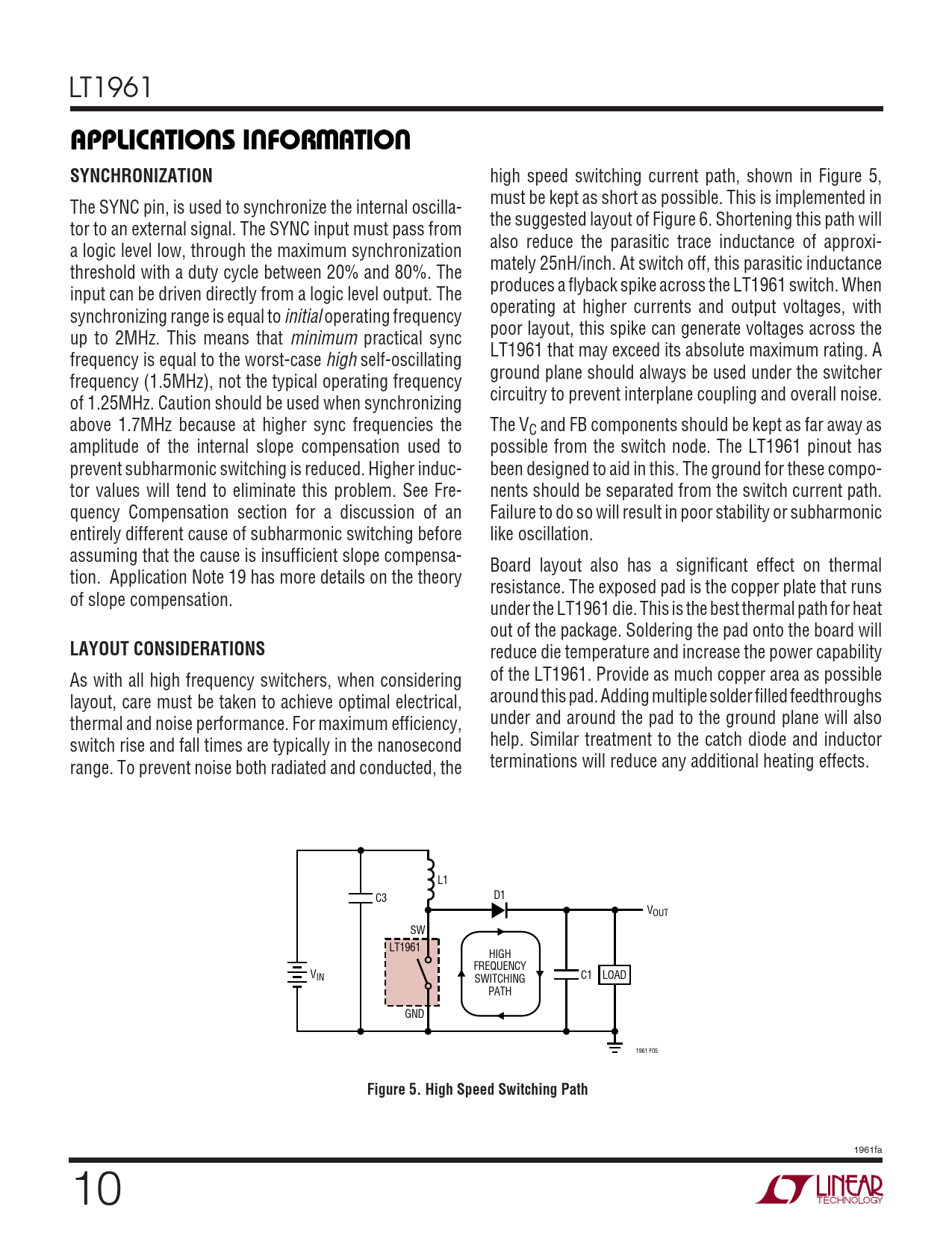 LT1961 UUWUAPPLICATIONS INFORMATIONSYNCHRONIZATION high speed switching current path, shown in Figure 5, must be kept as short as possible. This is implemented in The SYNC pin, is used to synchronize the internal oscilla- the suggested layout of Figure 6. Shortening this path will tor to an external signal. The SYNC input must pass from also reduce the parasitic trace inductance of approxi- a logic level low, through the maximum synchronization mately 25nH/inch. At switch off, this parasitic inductance threshold with a duty cycle between 20% and 80%. The produces a flyback spike across the LT1961 switch. When input can be driven directly from a logic level output. The operating at higher currents and output voltages, with synchronizing range is equal to initial operating frequency poor layout, this spike can generate voltages across the up to 2MHz. This means that minimum practical sync LT1961 that may exceed its absolute maximum rating. A frequency is equal to the worst-case high self-oscillating ground plane should always be used under the switcher frequency (1.5MHz), not the typical operating frequency circuitry to prevent interplane coupling and overall noise. of 1.25MHz. Caution should be used when synchronizing above 1.7MHz because at higher sync frequencies the The VC and FB components should be kept as far away as amplitude of the internal slope compensation used to possible from the switch node. The LT1961 pinout has prevent subharmonic switching is reduced. Higher induc- been designed to aid in this. The ground for these compo- tor values will tend to eliminate this problem. See Fre- nents should be separated from the switch current path. quency Compensation section for a discussion of an Failure to do so will result in poor stability or subharmonic entirely different cause of subharmonic switching before like oscillation. assuming that the cause is insufficient slope compensa- Board layout also has a significant effect on thermal tion. Application Note 19 has more details on the theory resistance. The exposed pad is the copper plate that runs of slope compensation. under the LT1961 die. This is the best thermal path for heat out of the package. Soldering the pad onto the board will LAYOUT CONSIDERATIONS reduce die temperature and increase the power capability As with all high frequency switchers, when considering of the LT1961. Provide as much copper area as possible layout, care must be taken to achieve optimal electrical, around this pad. Adding multiple solder filled feedthroughs thermal and noise performance. For maximum efficiency, under and around the pad to the ground plane will also switch rise and fall times are typically in the nanosecond help. Similar treatment to the catch diode and inductor range. To prevent noise both radiated and conducted, the terminations will reduce any additional heating effects. L1 D1 C3 VOUT SW LT1961 HIGH FREQUENCY VIN C1 SWITCHING LOAD PATH GND 1961 F05 Figure 5. High Speed Switching Path 1961fa 10