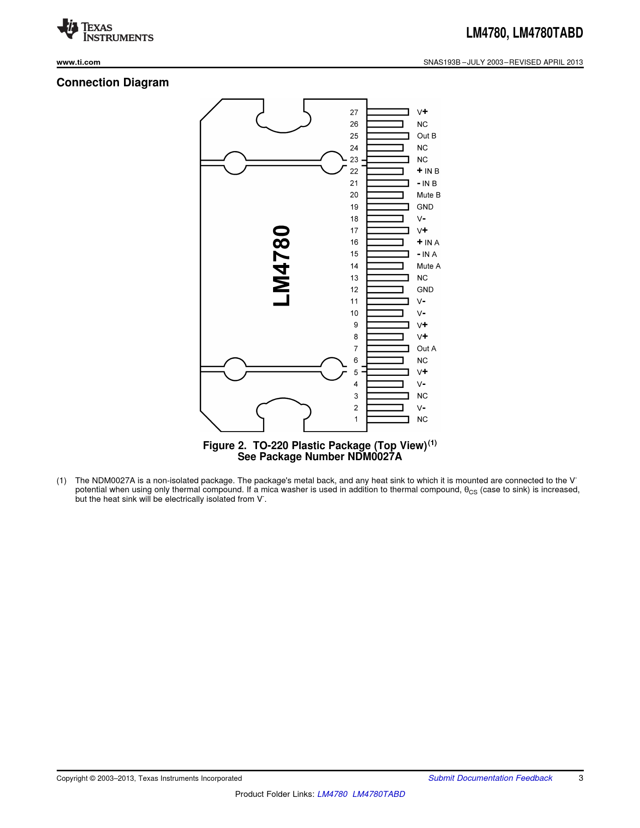 (1) The NDM0027A is a non-isolated package. The package's metal back, and any heat sink to which it is mounted are connected to the V- potential when using only thermal compound. If a mica washer is used in addition to thermal compound, θCS (case to sink) is increased, but the heat sink will be electrically isolated from V-. Copyright © 2003–2013, Texas Instruments Incorporated Submit Documentation Feedback 3 Product Folder Links: LM4780 LM4780TABD Document Outline Features Applications Key Specifications Description Typical Application Connection Diagram Absolute Maximum Ratings Operating Ratings Electrical Characteristics Bridged Amplifier Application Circuit Parallel Amplifier Application Circuit Single Supply Application Circuit Auxiliary Amplifier Application Circuit External Components Description Optional External Component Interaction Typical Performance Characteristics Application Information MUTE MODE UNDER-VOLTAGE PROTECTION OVER-VOLTAGE PROTECTION SPiKe PROTECTION THERMAL PROTECTION DETERMlNlNG MAXIMUM POWER DISSIPATION DETERMINING THE CORRECT HEAT SINK SUPPLY BYPASSING BRIDGED AMPLIFIER APPLICATION PARALLEL AMPLIFIER APPLICATION SINGLE-SUPPLY AMPLIFIER APPLICATION CLICKS AND POPS PROPER SELECTION OF EXTERNAL COMPONENTS HIGH PERFORMANCE CONSIDERATIONS SIGNAL-TO-NOISE RATIO LEAD INDUCTANCE PHYSICAL IC MOUNTING CONSIDERATIONS LAYOUT, GROUND LOOPS AND STABILITY REACTIVE LOADING INVERTING AMPLIFIER APPLICATION LM4780 REFERENCE BOARD ARTWORK Bill Of Materials For Reference Pcb Revision History Page 1