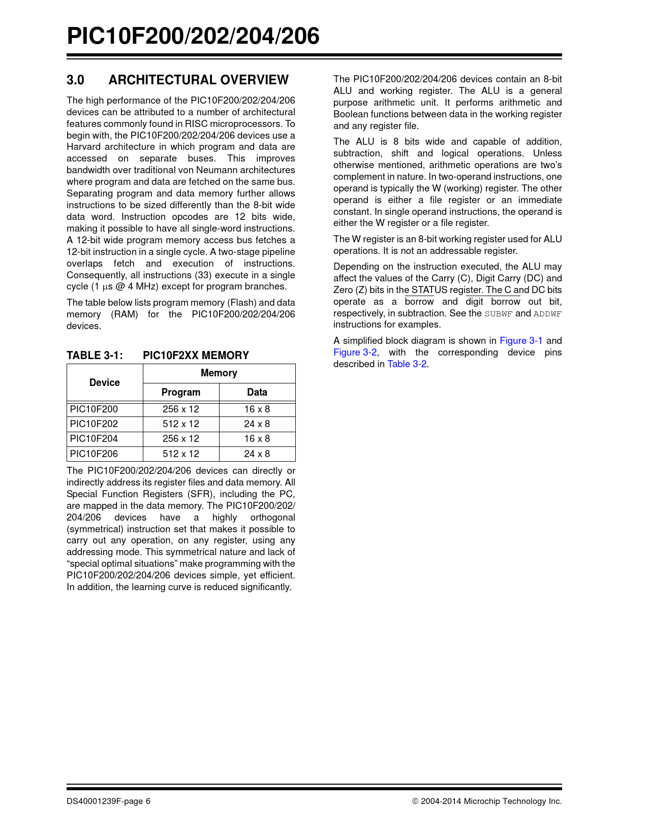PIC10F200/202/204/206 3.0 ARCHITECTURAL OVERVIEW The high performance of the PIC10F200/202/204/206 devices can be attributed to a number of architectural features commonly found in RISC microprocessors. To begin with, the PIC10F200/202/204/206 devices use a Harvard architecture in which program and data are accessed on separate buses. This improves bandwidth over traditional von Neumann architectures where program and data are fetched on the same bus. Separating program and data memory further allows instructions to be sized differently than the 8-bit wide data word. Instruction opcodes are 12 bits wide, making it possible to have all single-word instructions. A 12-bit wide program memory access bus fetches a 12-bit instruction in a single cycle. A two-stage pipeline overlaps fetch and execution of instructions. Consequently, all instructions (33) execute in a single cycle (1 s @ 4 MHz) except for program branches. The table below lists program memory (Flash) and data memory (RAM) for the PIC10F200/202/204/206 devices. TABLE 3-1: PIC10F2XX MEMORY The PIC10F200/202/204/206 devices contain an 8-bit ALU and working register. The ALU is a general purpose arithmetic unit. It performs arithmetic and Boolean functions between data in the working register and any register file. The ALU is 8 bits wide and capable of addition, subtraction, shift and logical operations. Unless otherwise mentioned, arithmetic operations are two’s complement in nature. In two-operand instructions, one operand is typically the W (working) register. The other operand is either a file register or an immediate constant. In single operand instructions, the operand is either the W register or a file register. The W register is an 8-bit working register used for ALU operations. It is not an addressable register. Depending on the instruction executed, the ALU may affect the values of the Carry (C), Digit Carry (DC) and Zero (Z) bits in the STATUS register. The C and DC bits operate as a borrow and digit borrow out bit, respectively, in subtraction. See the SUBWF and ADDWF instructions for examples. A simplified block diagram is shown in Figure 3-1 and Figure 3-2, with the corresponding device pins described in Table 3-2. Memory Device Program Data PIC10F200 256 x 12 16 x 8 PIC10F202 512 x 12 24 x 8 PIC10F204 256 x 12 16 x 8 PIC10F206 512 x 12 24 x 8 The PIC10F200/202/204/206 devices can directly or indirectly address its register files and data memory. All Special Function Registers (SFR), including the PC, are mapped in the data memory. The PIC10F200/202/ 204/206 devices have a highly orthogonal (symmetrical) instruction set that makes it possible to carry out any operation, on any register, using any addressing mode. This symmetrical nature and lack of “special optimal situations” make programming with the PIC10F200/202/204/206 devices simple, yet efficient. In addition, the learning curve is reduced significantly. DS40001239F-page 6 2004-2014 Microchip Technology Inc.