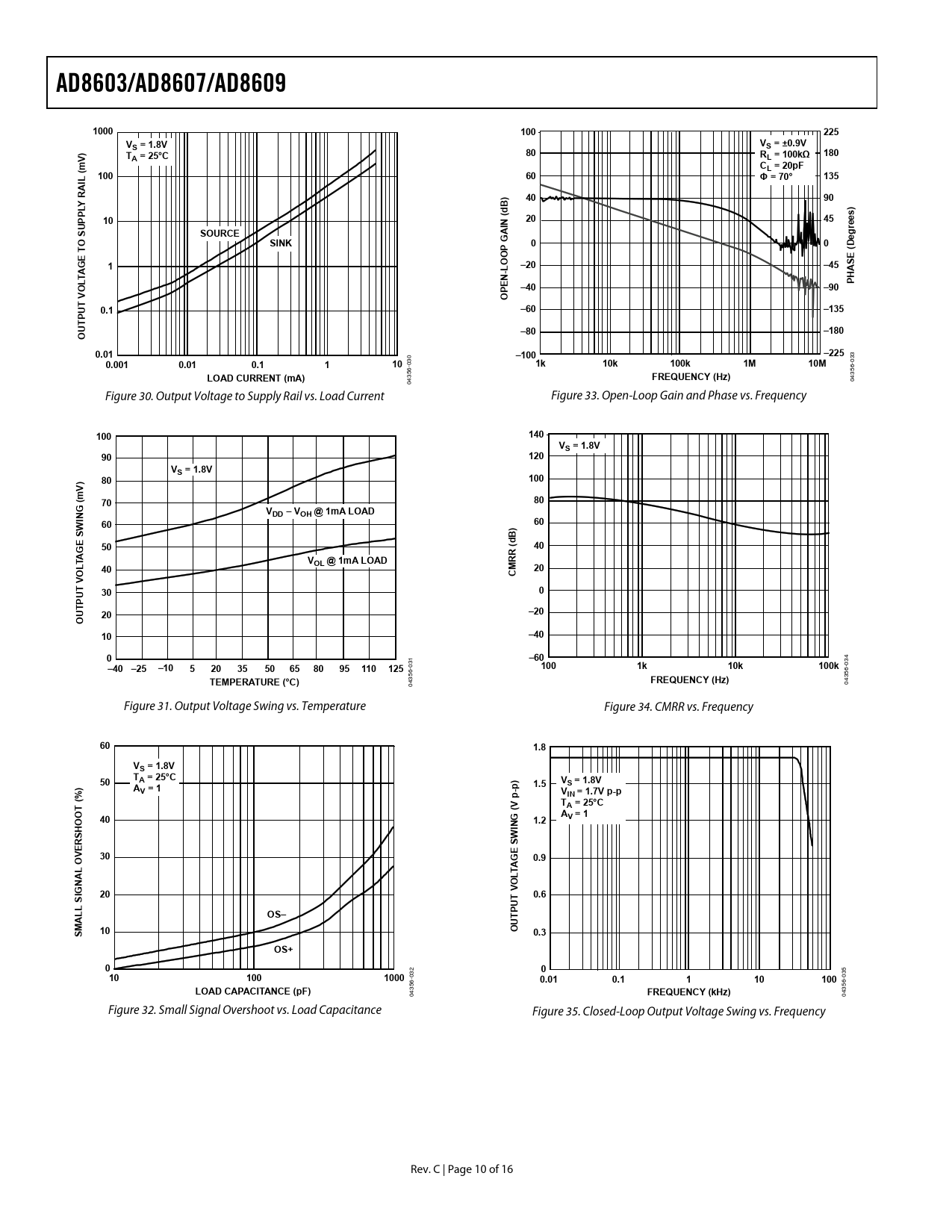 AD8603/AD8607/AD8609. 1000. 100. 225. S = 1.8V. S = ±0.9V. 180. A = 25°C. L = 100kΩ. (mV). L = 20pF. 135. Φ = 70°. A R. B d. PPL. rees). SOURCE. SINK. –20. –45