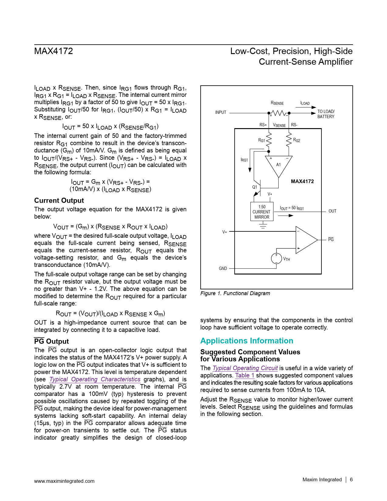 link to page 3 link to page 1 link to page 7 MAX4172 Low-Cost, Precision, High-Side Current-Sense Amplifier ILOAD x RSENSE. Then, since IRG1 flows through RG1, IRG1 x RG1 = ILOAD x RSENSE. The internal current mirror multiplies IRG1 by a factor of 50 to give IOUT = 50 x IRG1. RSENSE ILOAD Substituting IOUT/50 for IRG1, (IOUT/50) x RG1 = ILOAD INPUT TO LOAD/ x RSENSE, or: BATTERY IOUT = 50 x ILOAD x (RSENSE/RG1) RS+ VSENSE RS- The internal current gain of 50 and the factory-trimmed resistor R RG1 RG2 G1 combine to result in the device’s transcon- ductance (Gm) of 10mA/V. Gm is defined as being equal to IOUT/(VRS+ - VRS-). Since (VRS+ - VRS-) = ILOAD x IRG1 RSENSE, the output current (IOUT) can be calculated with A1 the following formula: IOUT = Gm x (VRS+ - VRS-) = MAX4172 (10mA/V) x (ILOAD x RSENSE) Q1 V+ Current Output The output voltage equation for the MAX4172 is given 1:50 IOUT = 50 IRG1 CURRENT OUT below: MIRROR VOUT = (Gm) x (RSENSE x ROUT x ILOAD) where V V+ OUT = the desired full-scale output voltage, ILOAD equals the full-scale current being sensed, R PG SENSE equals the current-sense resistor, ROUT equals the voltage-setting resistor, and Gm equals the device’s VTH transconductance (10mA/V). GND The full-scale output voltage range can be set by changing the ROUT resistor value, but the output voltage must be no greater than V+ - 1.2V. The above equation can be modified to determine the R Figure 1. Functional Diagram OUT required for a particular full-scale range: ROUT = (VOUT)/(ILOAD x RSENSE x Gm) OUT is a high-impedance current source that can be systems by ensuring that the components in the control integrated by connecting it to a capacitive load. loop have sufficient voltage to operate correctly. PG OutputApplications Information The PG output is an open-collector logic output that Suggested Component Values indicates the status of the MAX4172’s V+ power supply. A for Various Applications logic low on the PG output indicates that V+ is sufficient to The Typical Operating Circuit is useful in a wide variety of power the MAX4172. This level is temperature dependent applications. Table 1 shows suggested component values (see Typical Operating Characteristics graphs), and is and indicates the resulting scale factors for various applications typically 2.7V at room temperature. The internal PG required to sense currents from 100mA to 10A. comparator has a 100mV (typ) hysteresis to prevent possible oscillations caused by repeated toggling of the Adjust the RSENSE value to monitor higher/lower current PG output, making the device ideal for power-management levels. Select RSENSE using the guidelines and formulas systems lacking soft-start capability. An internal delay in the following section. (15μs, typ) in the PG comparator allows adequate time for power-on transients to settle out. The PG status indicator greatly simplifies the design of closed-loop www.maximintegrated.com Maxim Integrated │ 6